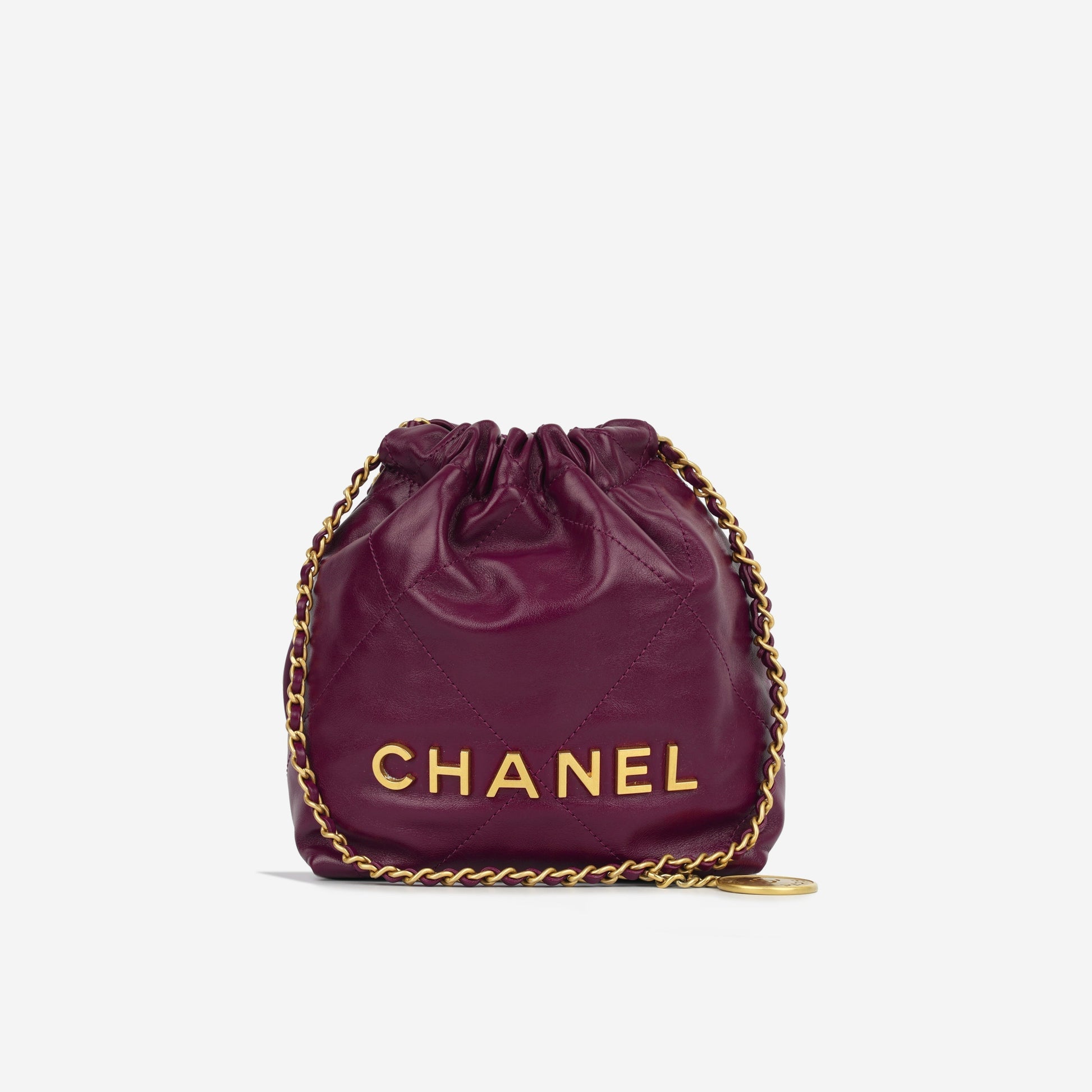 Carefully crafted from shiny crumpled calfskin leather, Chanel presents their 22 Mini. The chicest item for the lady that wants to carry everything around with them, this bag features Chanels classic interwoven back straps along with top handles to carry it handheld. This piece from 2023 is a well worthy addition to any luxury handbag collection.
