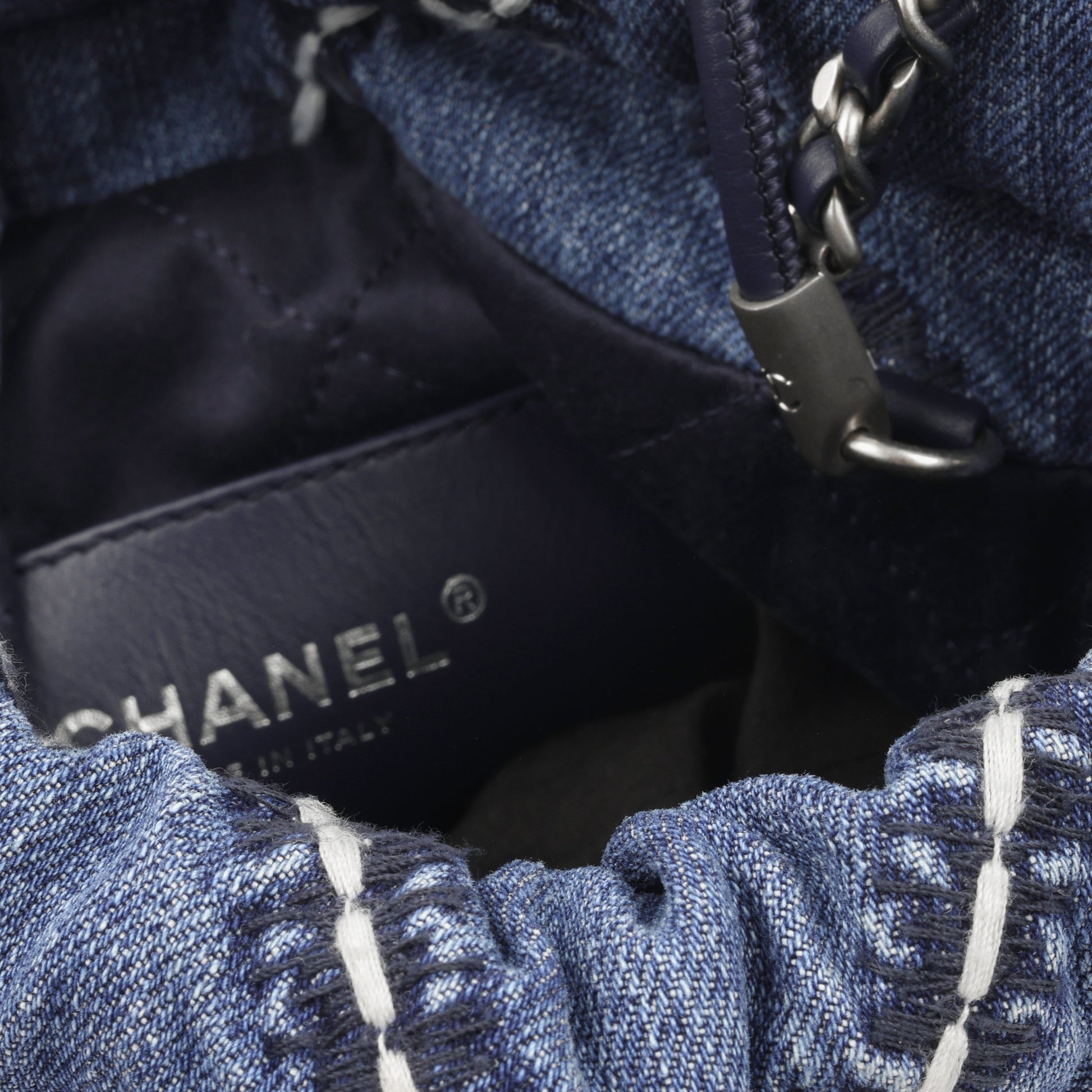 Carefully crafted from quilted stitched blue denim fabric, Chanel presents their 22 Mini. The chicest item for the lady that wants to carry everything around with them, this bag features Chanels classic interwoven back straps along with top handles to carry it handheld. This piece from 2023 is a well worthy addition to any luxury handbag collection.