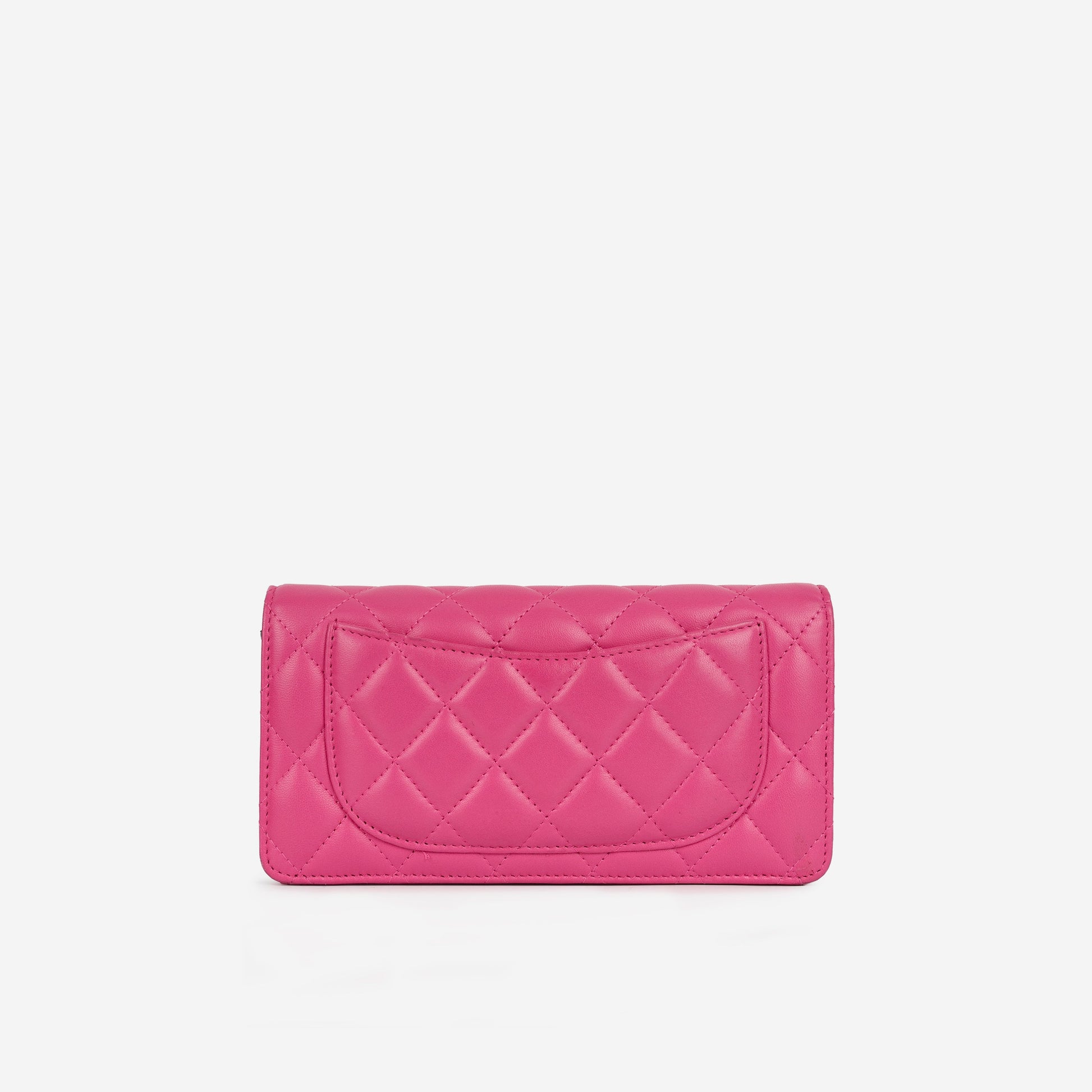 A sleek and sophisticated travel essential. Crafted from luxurious quilted pink lambskin leather in a striking pink hue, this compact holder combines elegance with practicality. Its bifold design offers convenient storage for cards, notes, and coins , while the sumptuously smooth interior ensures protection and style in equal measure.