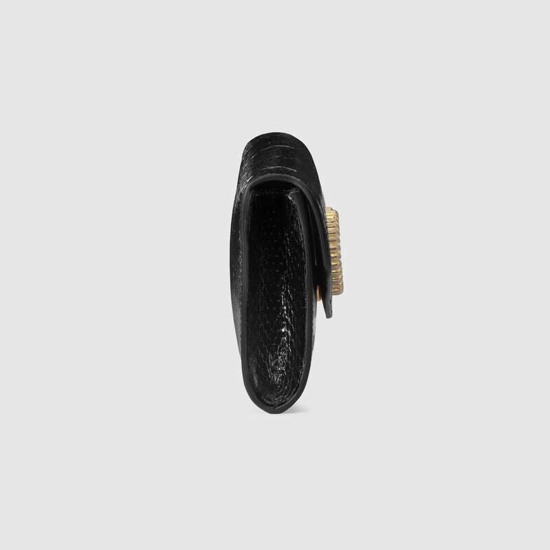 Made from black snakeskin, the broadway nighttime bag has a cultured shape with an envelope flap closure. the double g emblem accents the front with a twisted torchon design in a shiny gold tone.