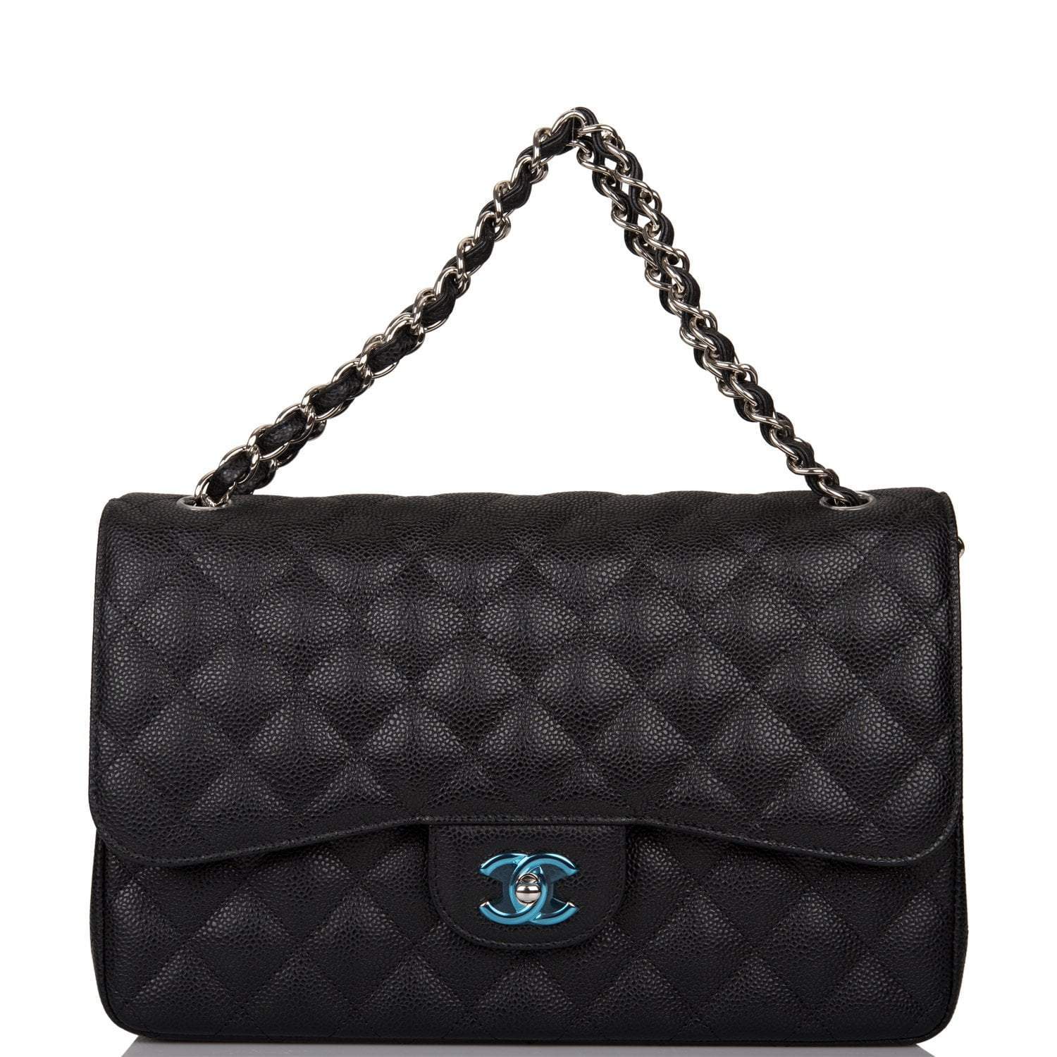 This Jumbo Classic Double Flap bag is in black caviar leather with silver tone hardware and features a front flap with signature CC turnlock closure, half moon back pocket, and adjustable interwoven silver tone chain link and black leather shoulder strap.
