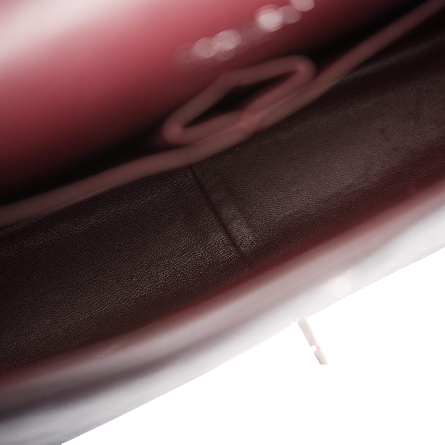 The interior is lined in burgundy color leather with the "love letter" zipper compartment under the first flap, an "outer" slit pocket under the second flap and an interior compartment features two open pockets separated by a "lipstick" compartment.