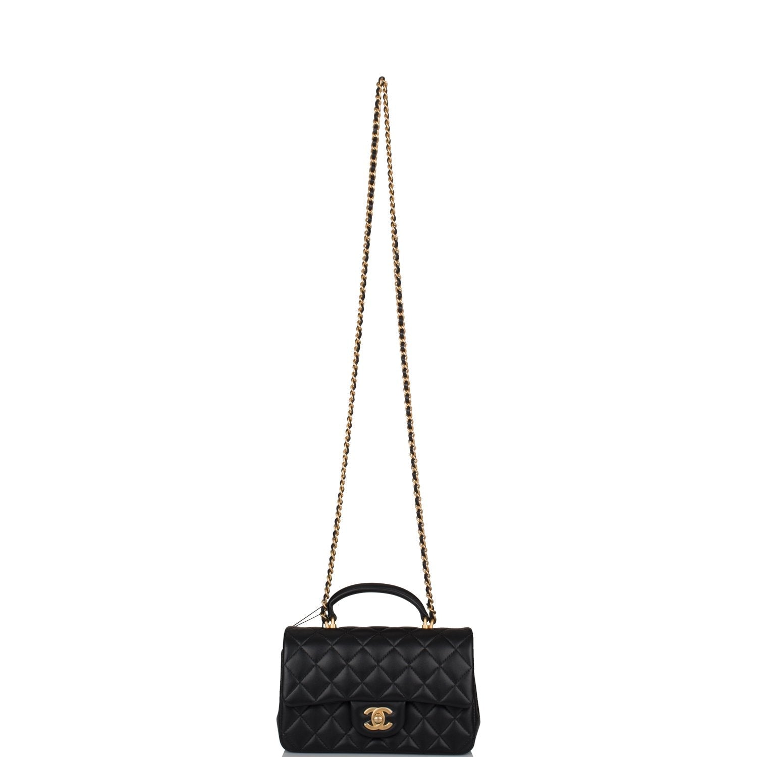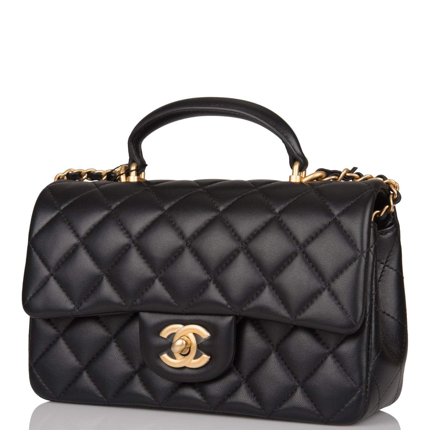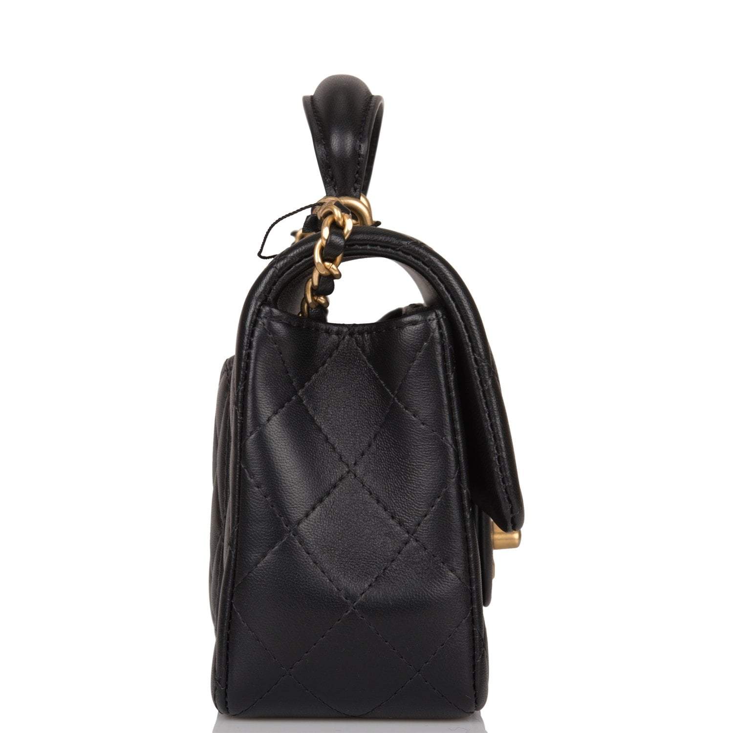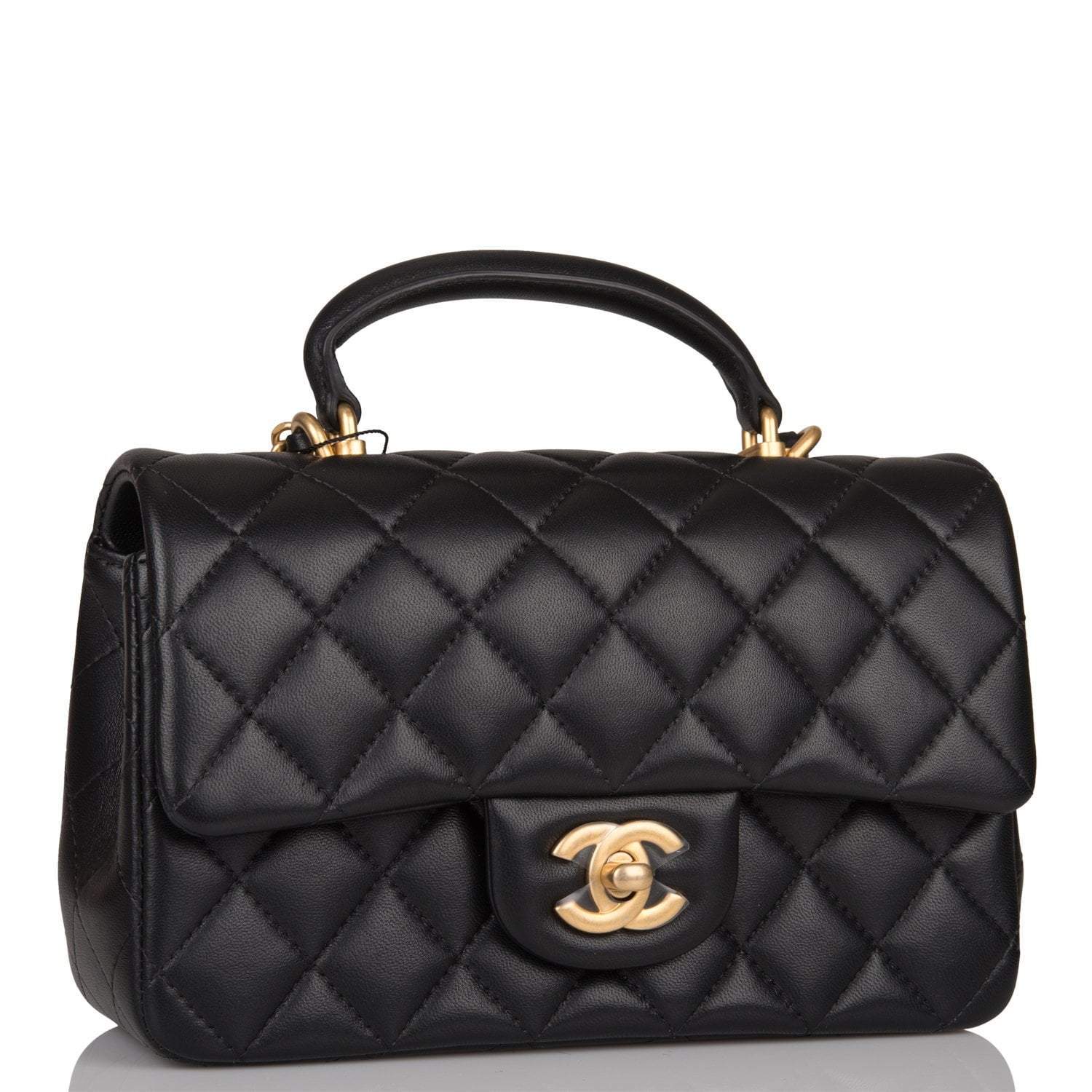 Chanel Black Quilted Lambskin Rectangular Mini Flap Bag with Top Handle Antique Gold Hardware
