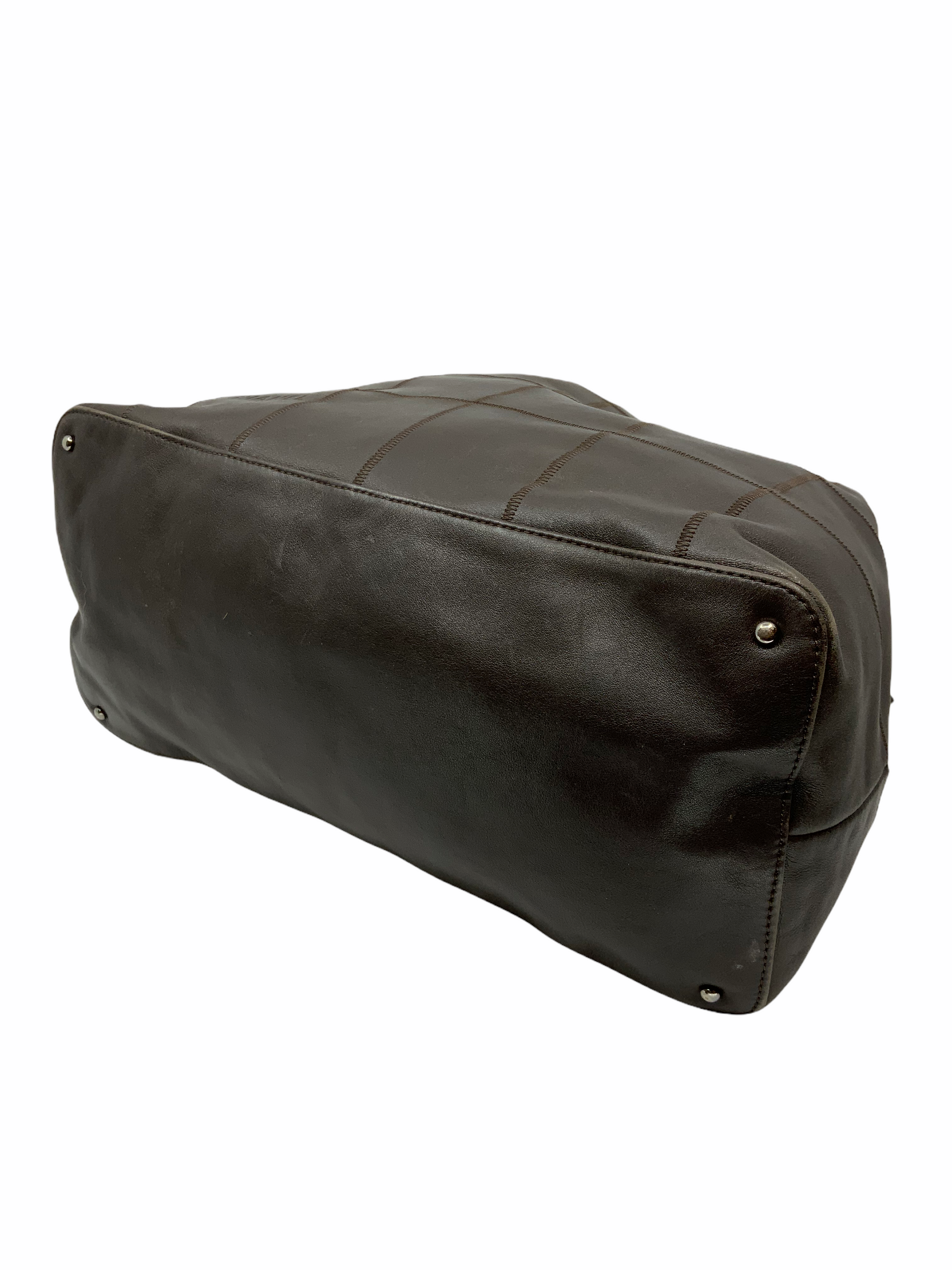 CHANEL Calfskin Square Stitched Tassel Hobo which makes for the perfect everyday carry-all. Beautifully crafted from chocolate brown square quilted calfskin leather and silver-tone hardware. Featuring dual flat leather looping shoulder straps and a signature 'CC' logo-engraved cinch drawstring tassel closure.