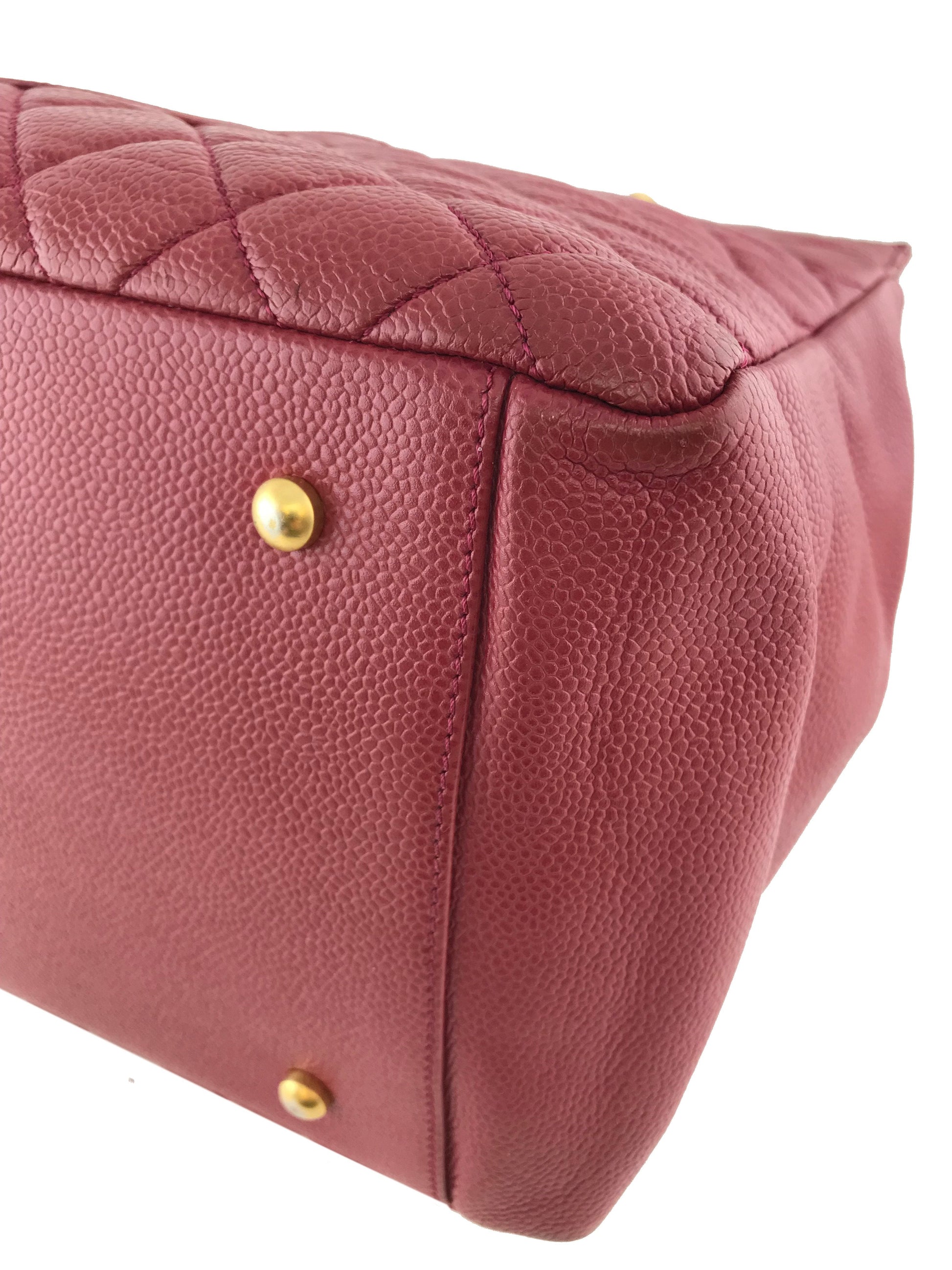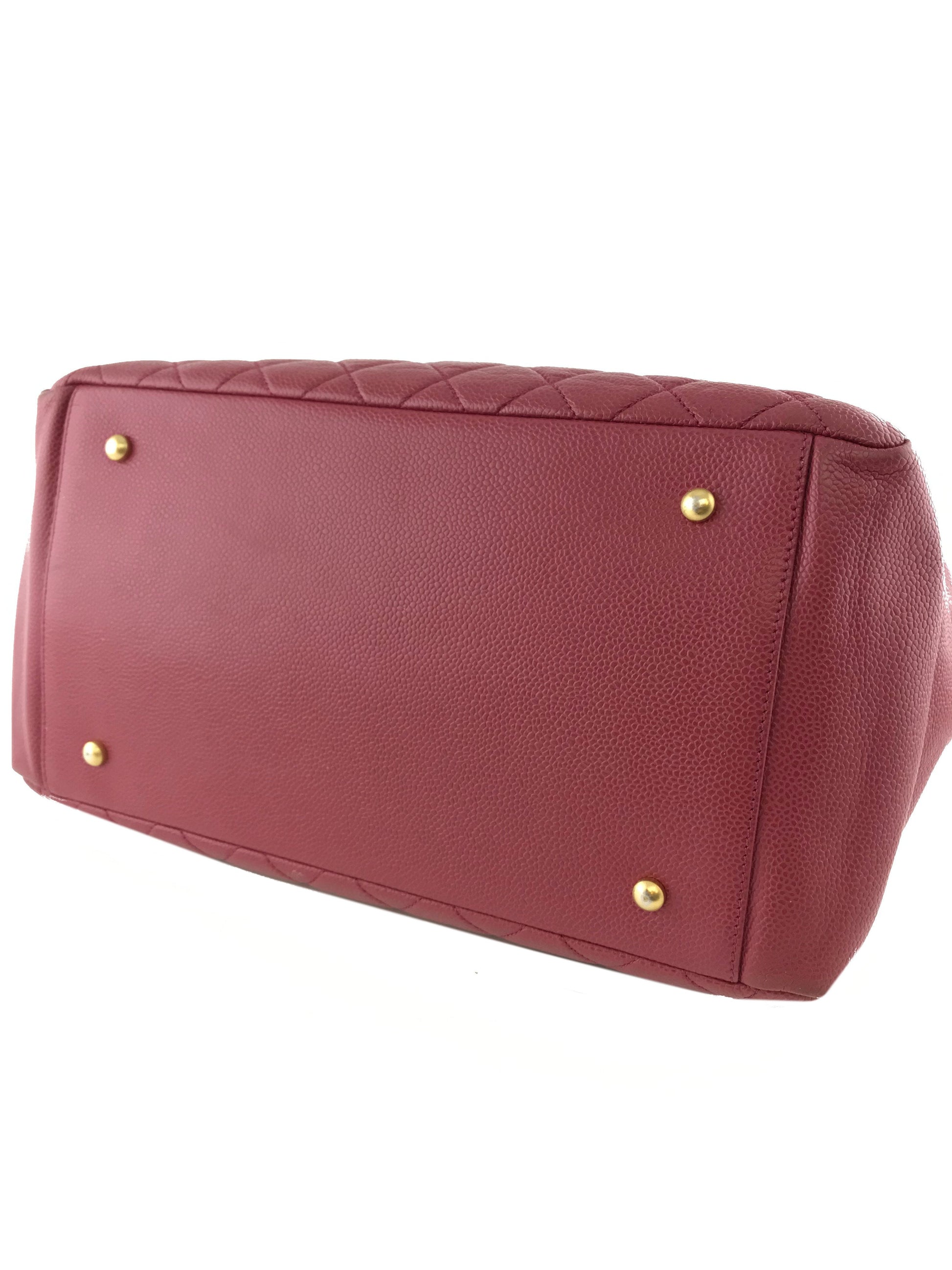 Prepare to turn heads when you carry, extremely rare Chanel Caviar Medium Timeless Tote Bag in burgundy. This bag features a large 'CC' logo at center, chain link straps threaded with tonal leather and matte gold-tone hardware.