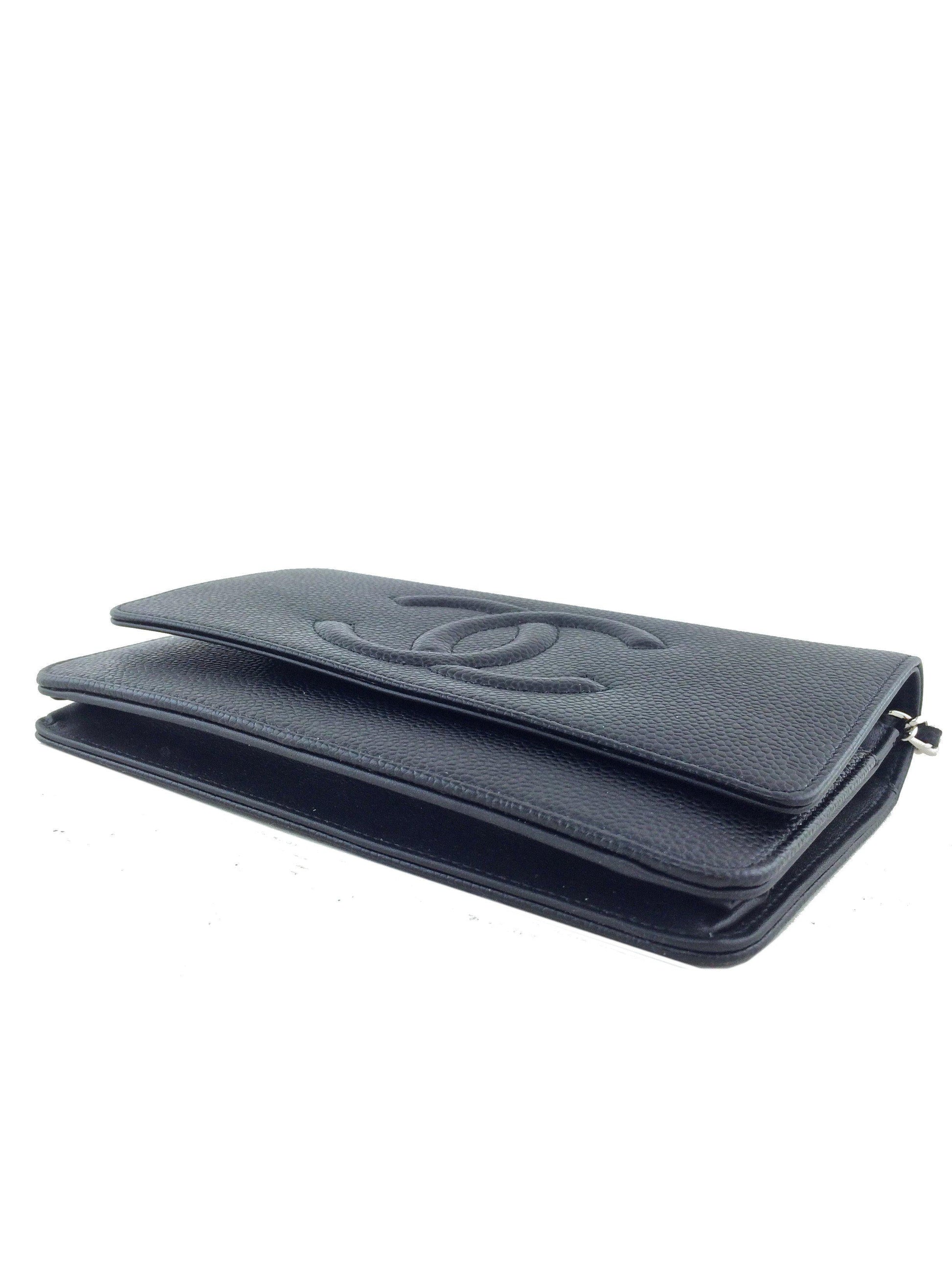 Chanel Caviar Wallet on Chain WOC Timeless Crossbody Bag crafted from Chanel's signature black caviar leather and silver-tone hardware. This highly sought after bag features a large tonal stitched CC logo at front with a long chain link and leather shoulder strap that has the option of being neatly tucked away and carried as a clutch. The front flap with snap closure opens to a functional interior of six credit card slots, one zip pocket and two open compartments.
