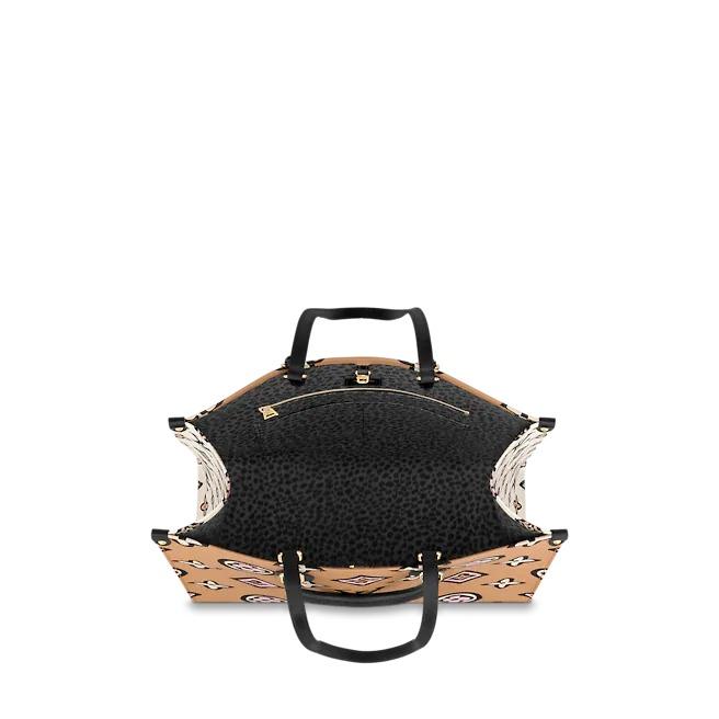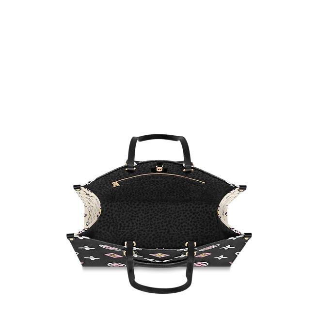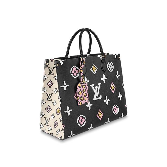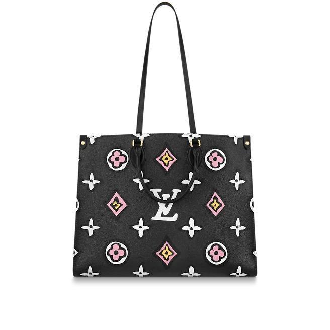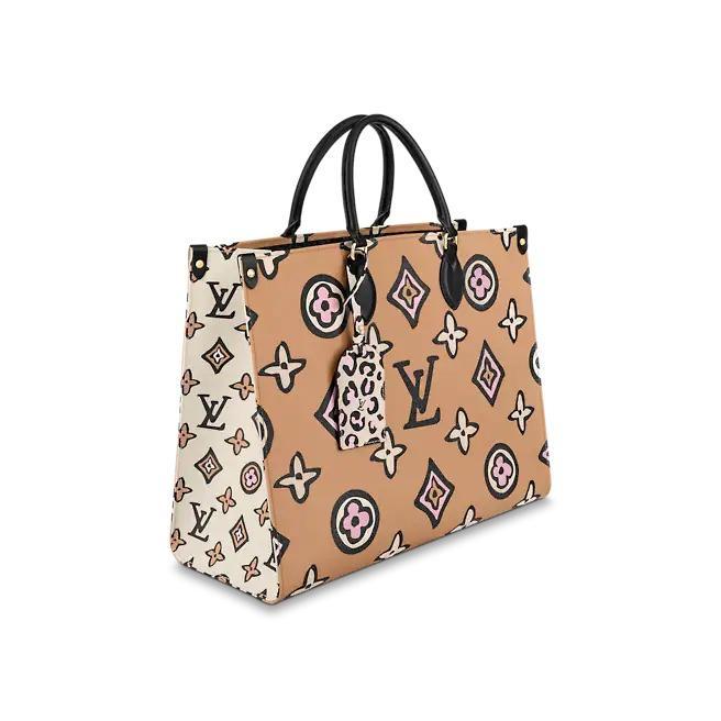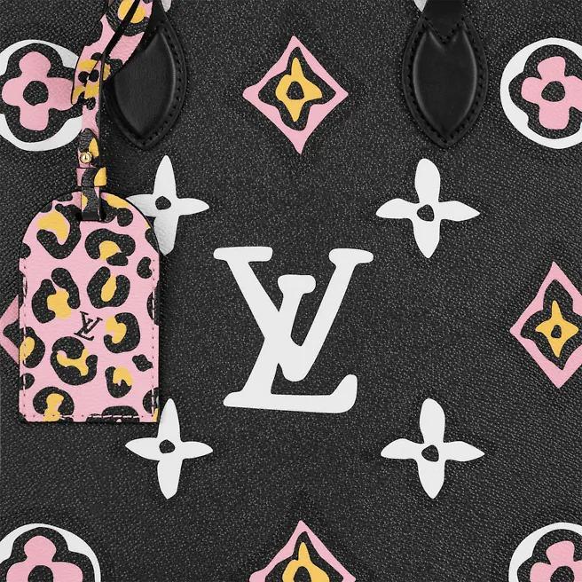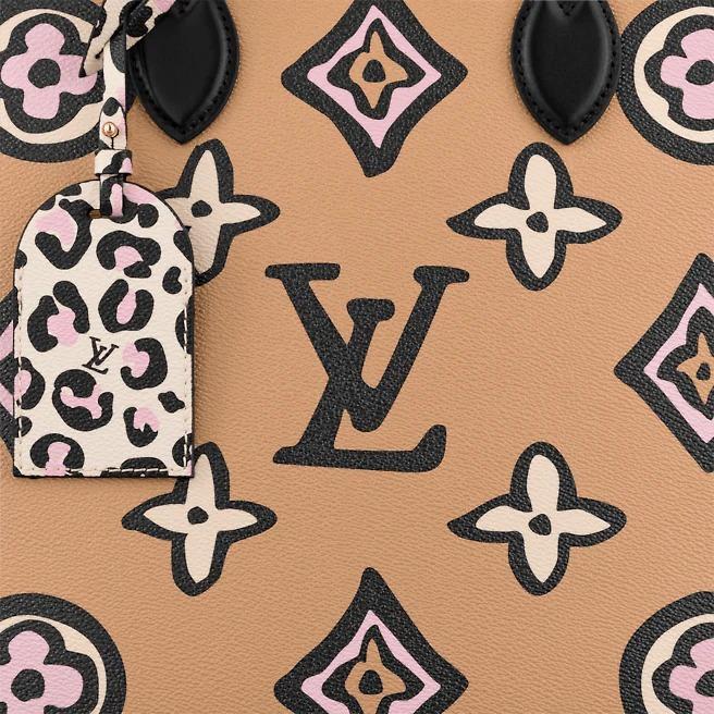 This Onthego GM carryall wears a graphic Monogram print this season, created especially for the Wild at Heart capsule. Inspired by an archival design, the pattern makes a striking fashion statement on this roomy tote, a stylish companion for business, shopping or travel. Long shoulder straps and twin Toron top handles provide several comfortable carry options.