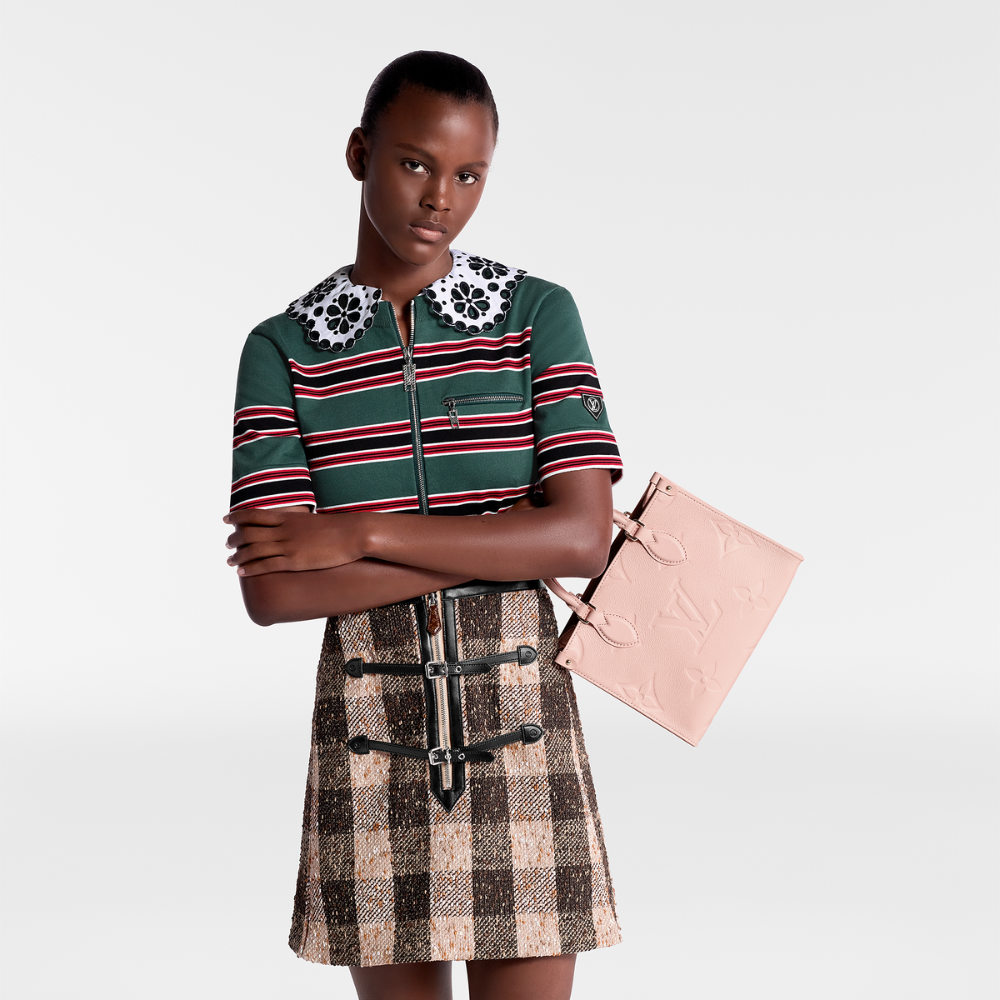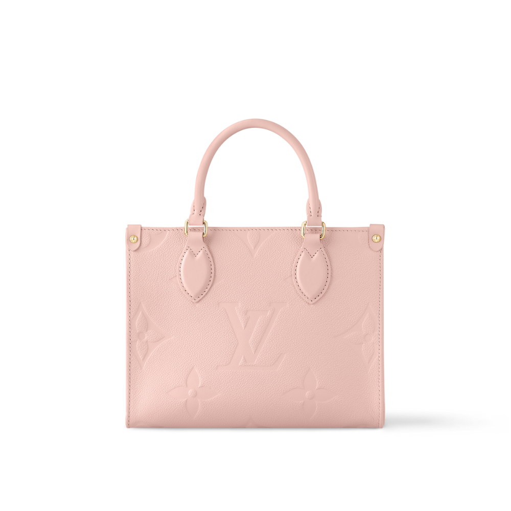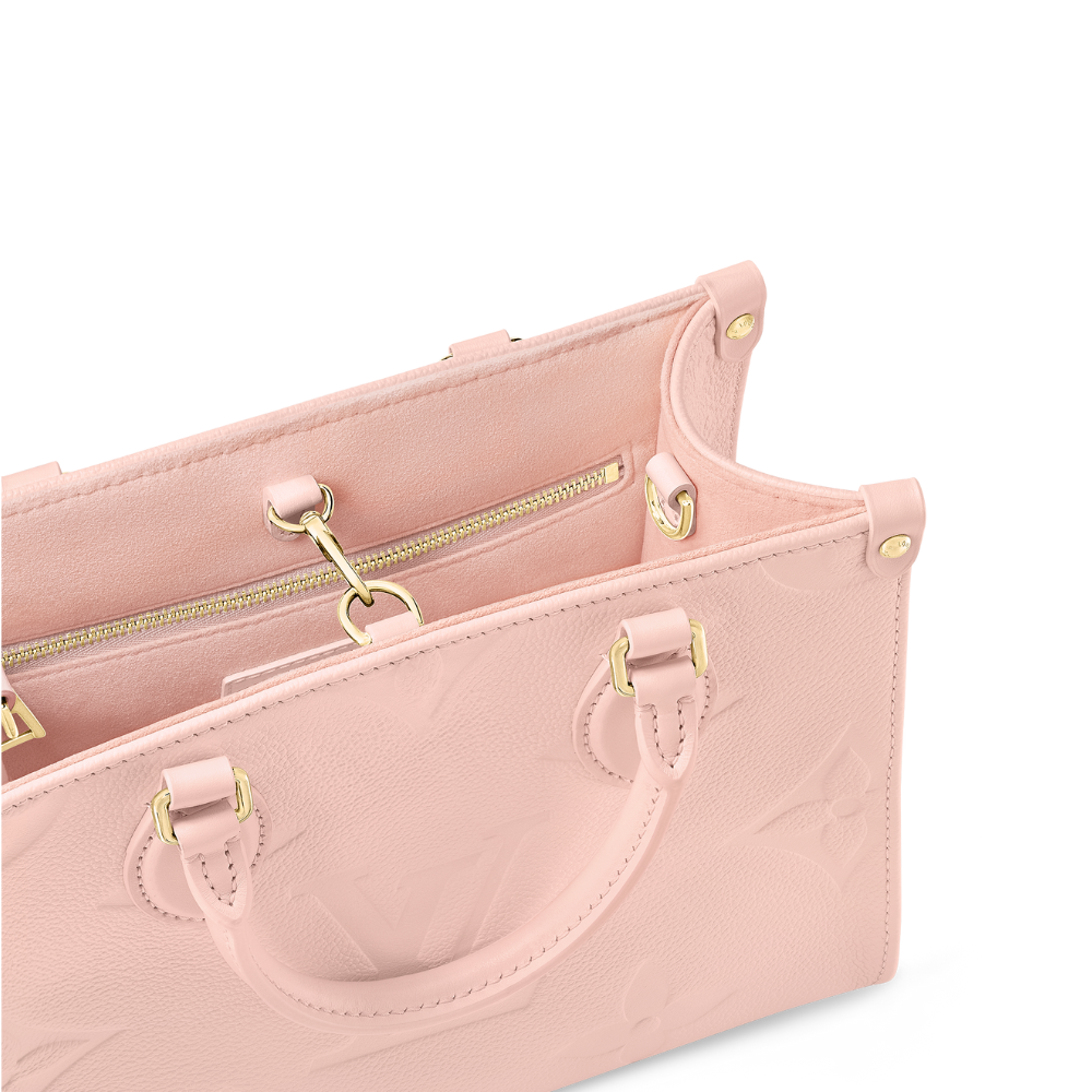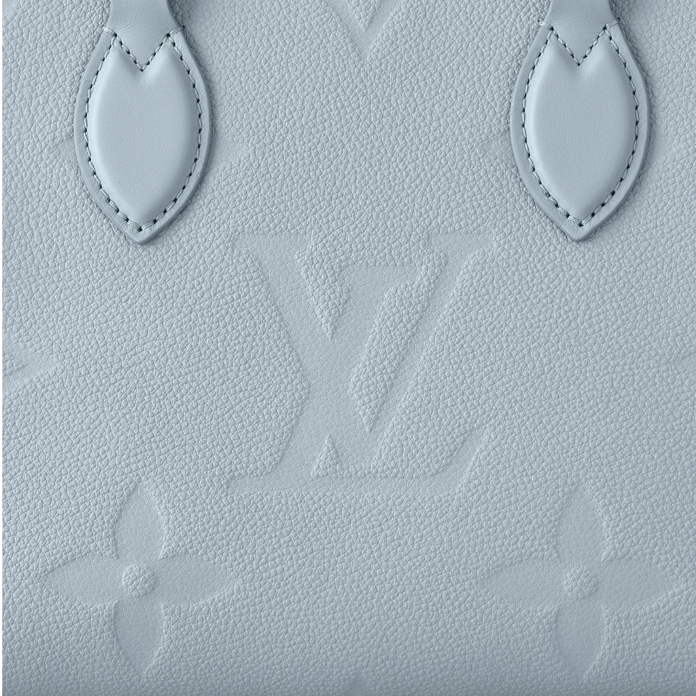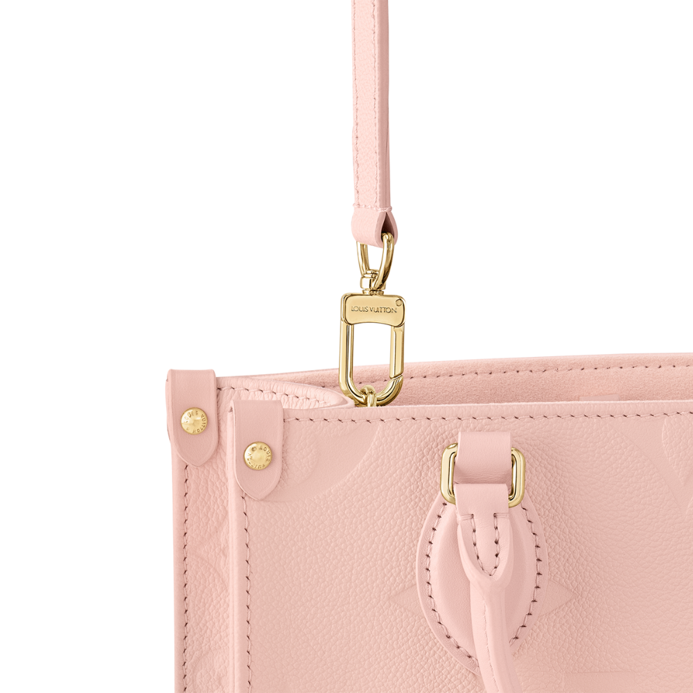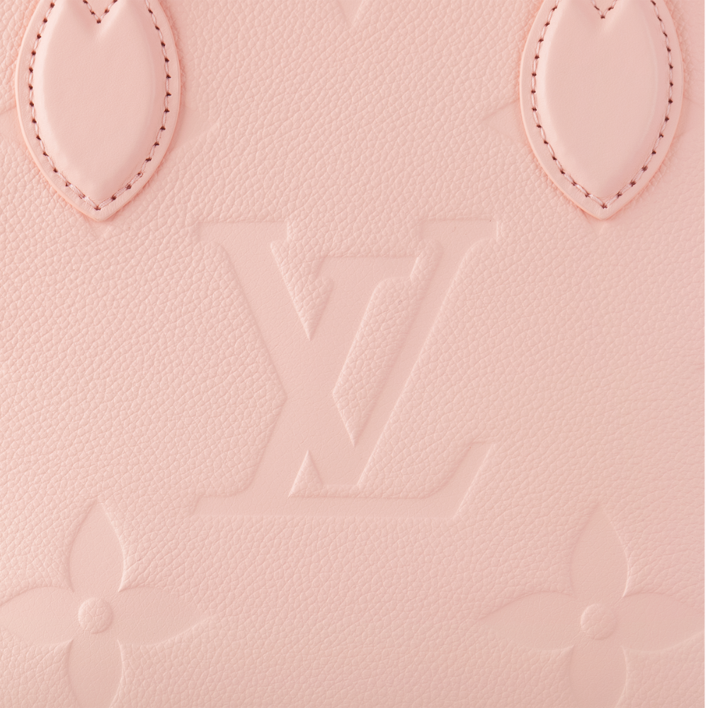 The OnTheGo PM is a tote-style handbag made from pastel-colored Monogram Empreinte leather, with distinctive Monogram embossing. The four riveted corner tabs evoke the House’s famed trunks. Inside, a large flat zipped pocket keeps papers and cards organized. Two rolled-leather top handles and a removable and adjustable strap enable various carry options.
