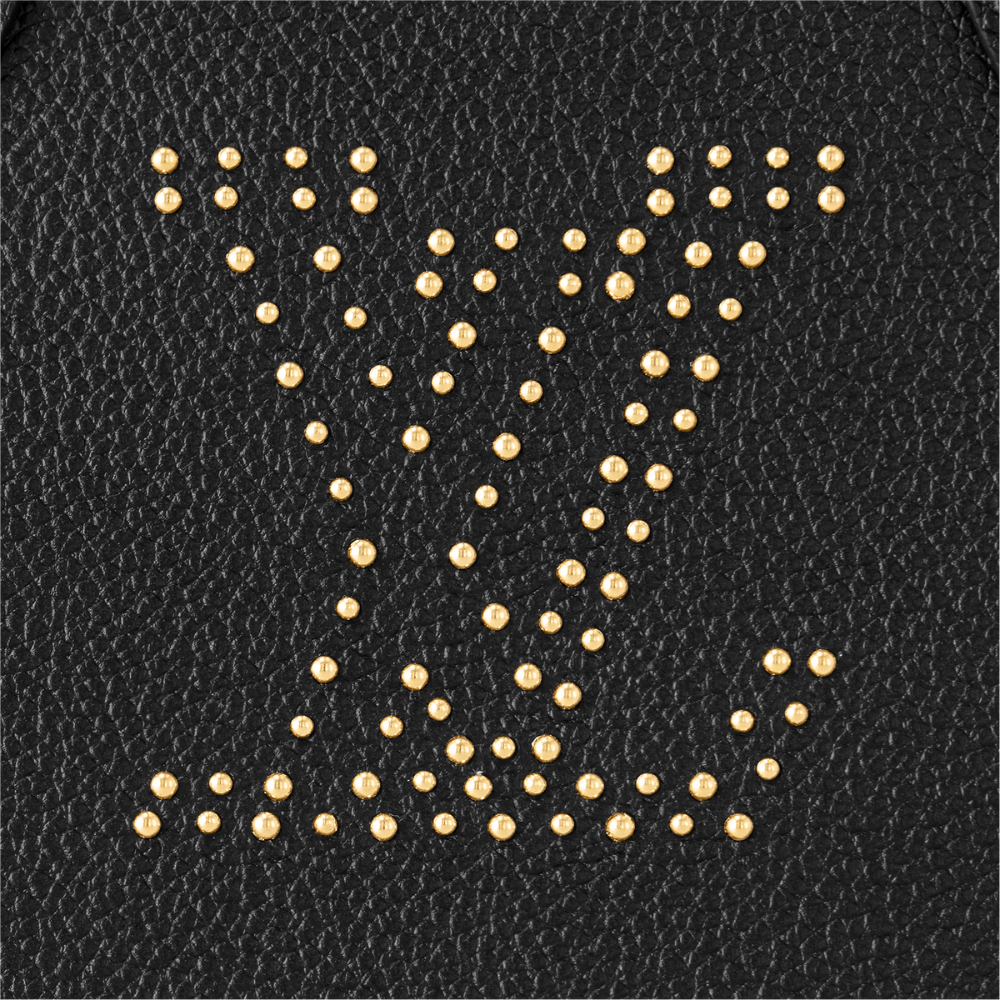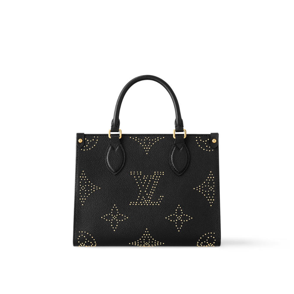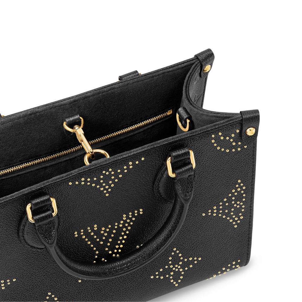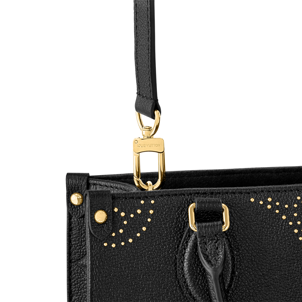 The OnTheGo PM handbag tote is made from grained cowhide leather with a Giant Monogram pattern composed of gold-coated studs. The rest of the hardware is gold-colored, including the rivets on the four corner tabs. In addition to the two top handles, there’s a detachable and adjustable strap for shoulder and cross-body carry.