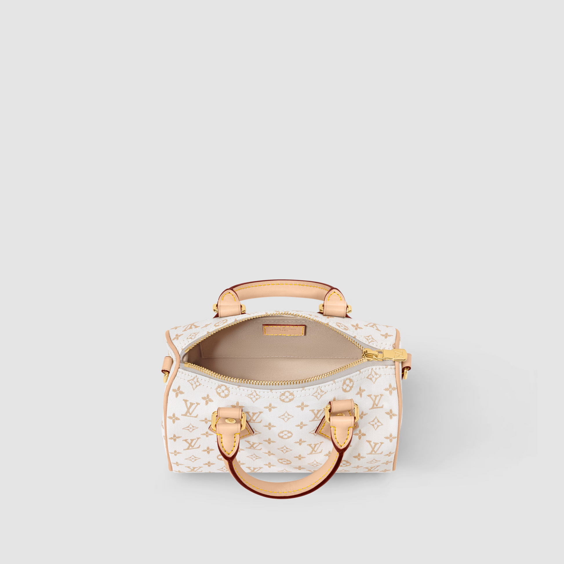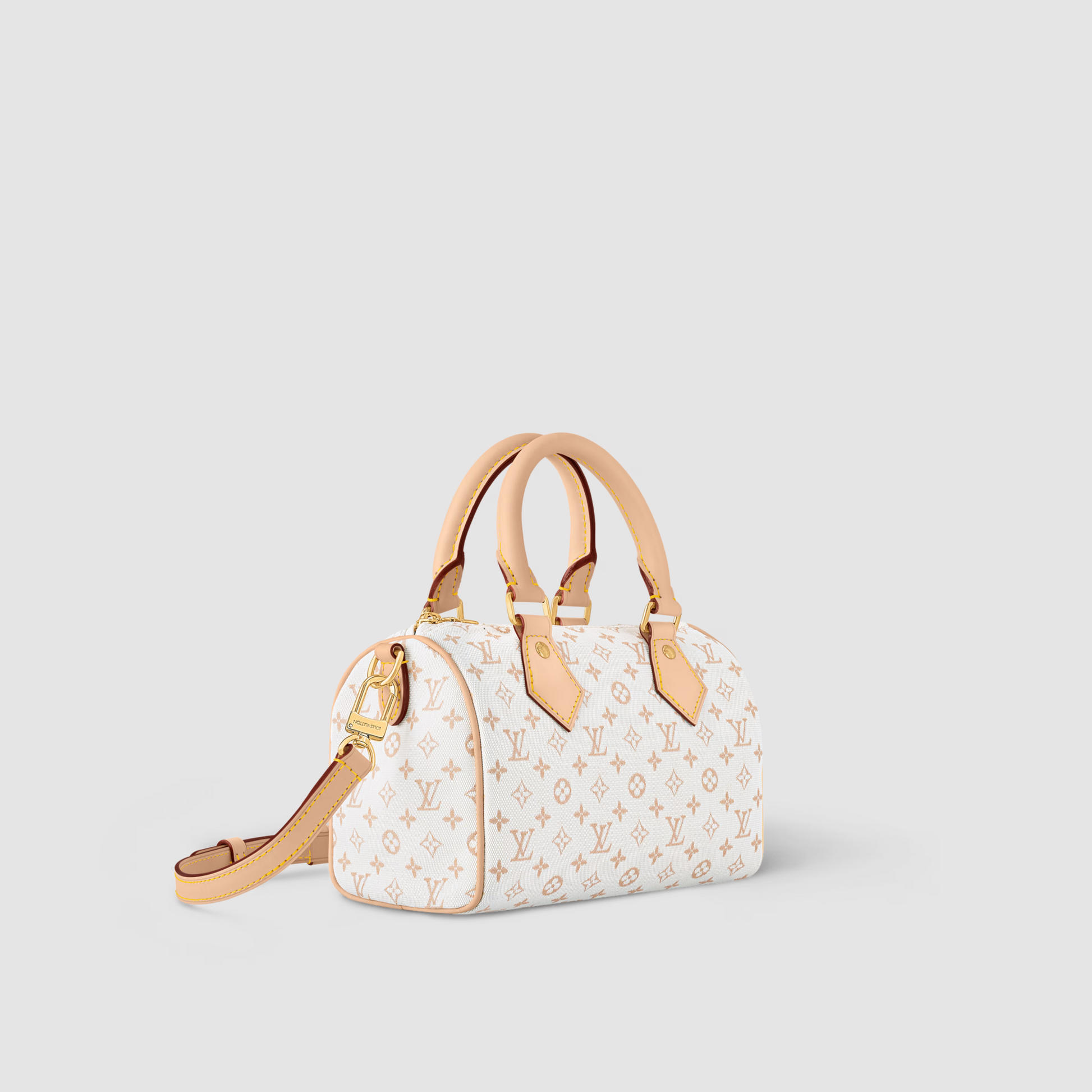 Characteristics: This Speedy Bandoulière 20 is crafted from supple polyamide, jacquard woven with the House’s latest Monogram Mini motif. The distinctive shape has two rolled-leather handles, plus a detachable and adjustable strap so it can be worn multiple ways. Signature details include the natural cowhide trims and gold-toned padlock, acting as markers of craftsmanship to those in the know.