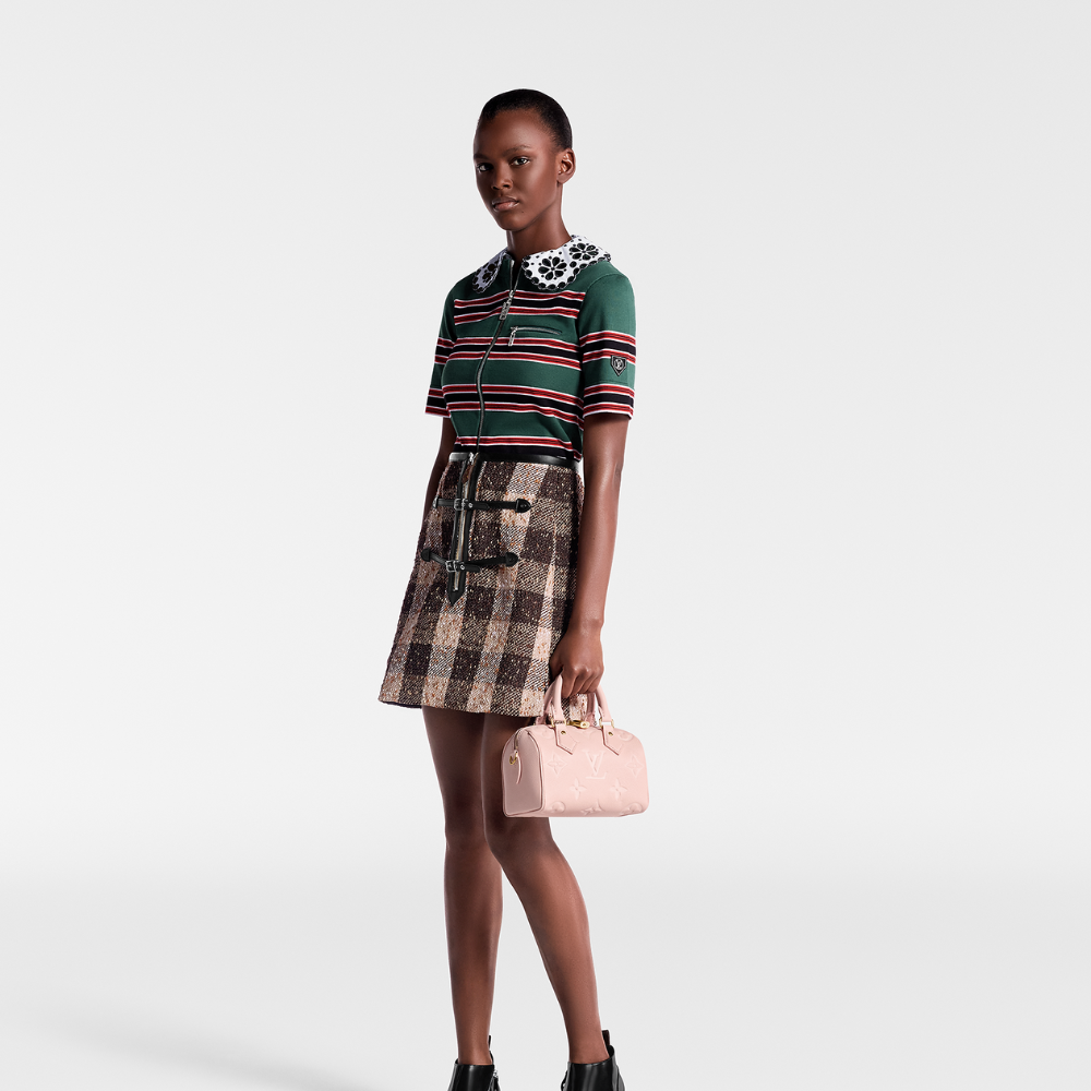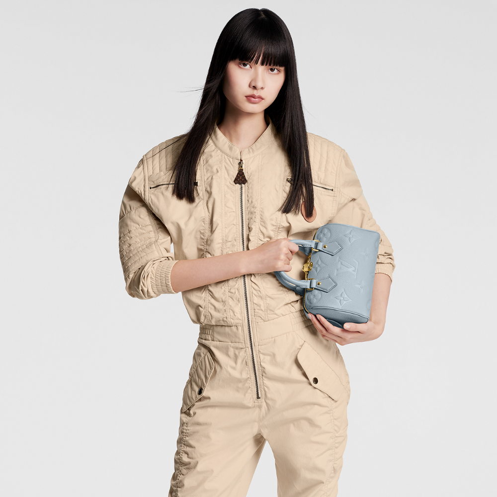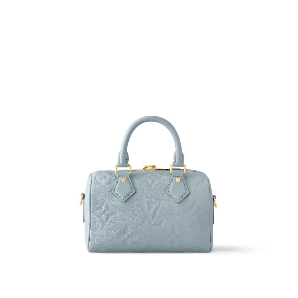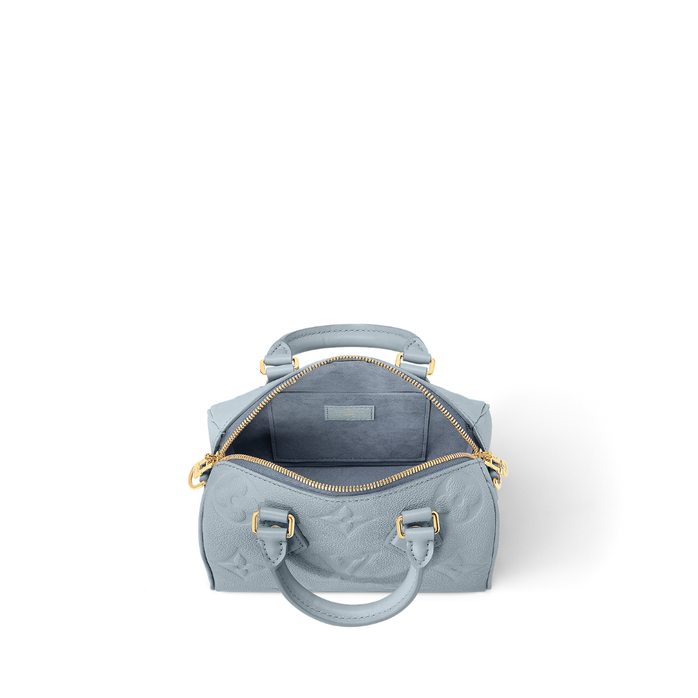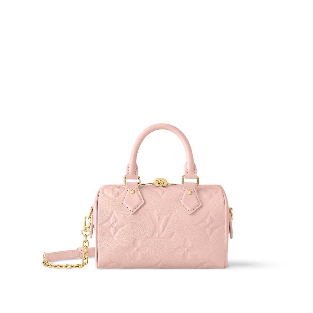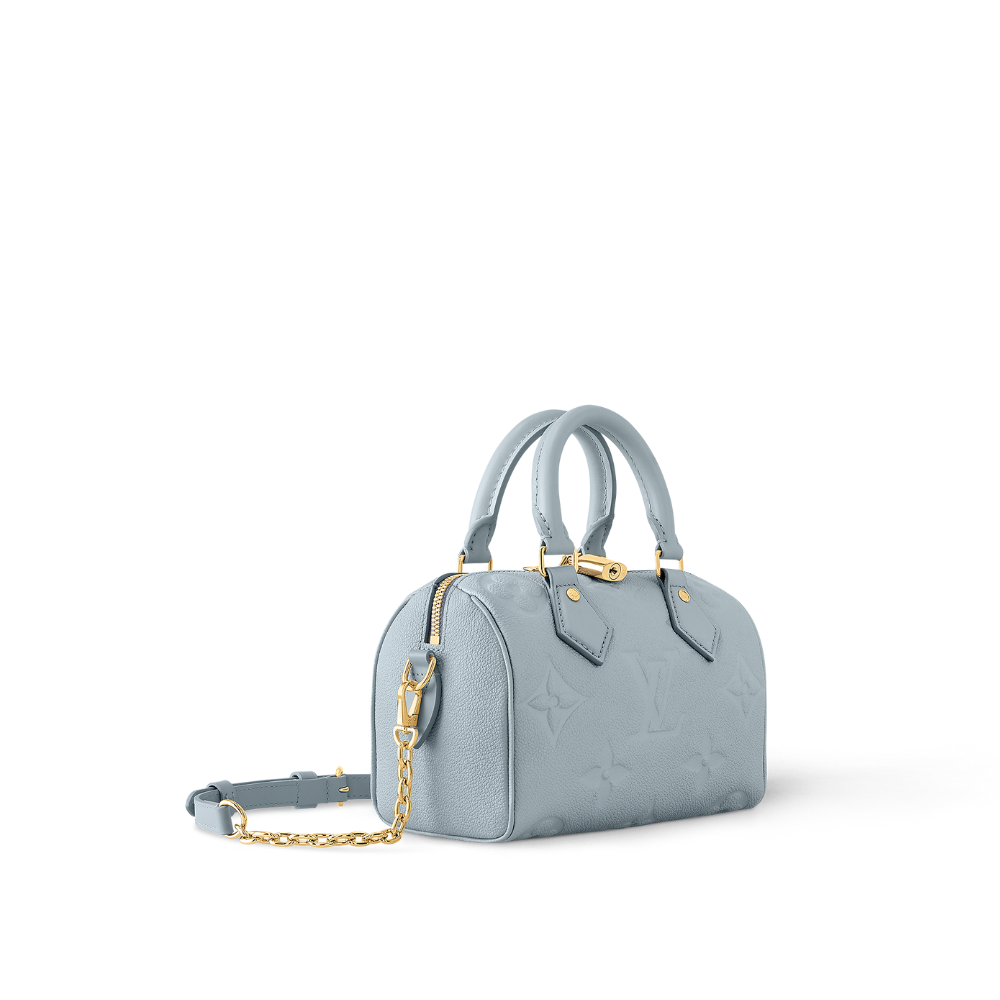 The Speedy 20 Bandoulière handbag is made from Monogram Empreinte leather in a soft pastel colorway. The bag’s unique shape is inspired by the House’s Speedy travel bag from the 1930s. A removable and adjustable chain-strap enables shoulder wear while the two top handles allow hand carry.