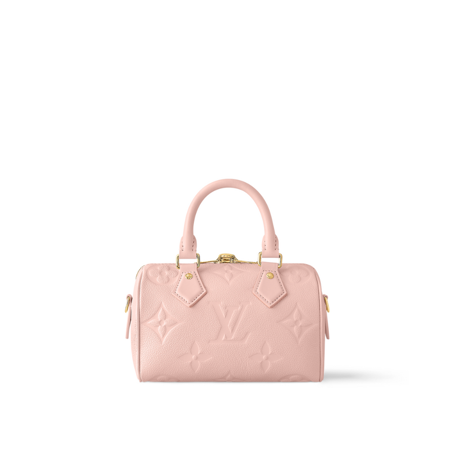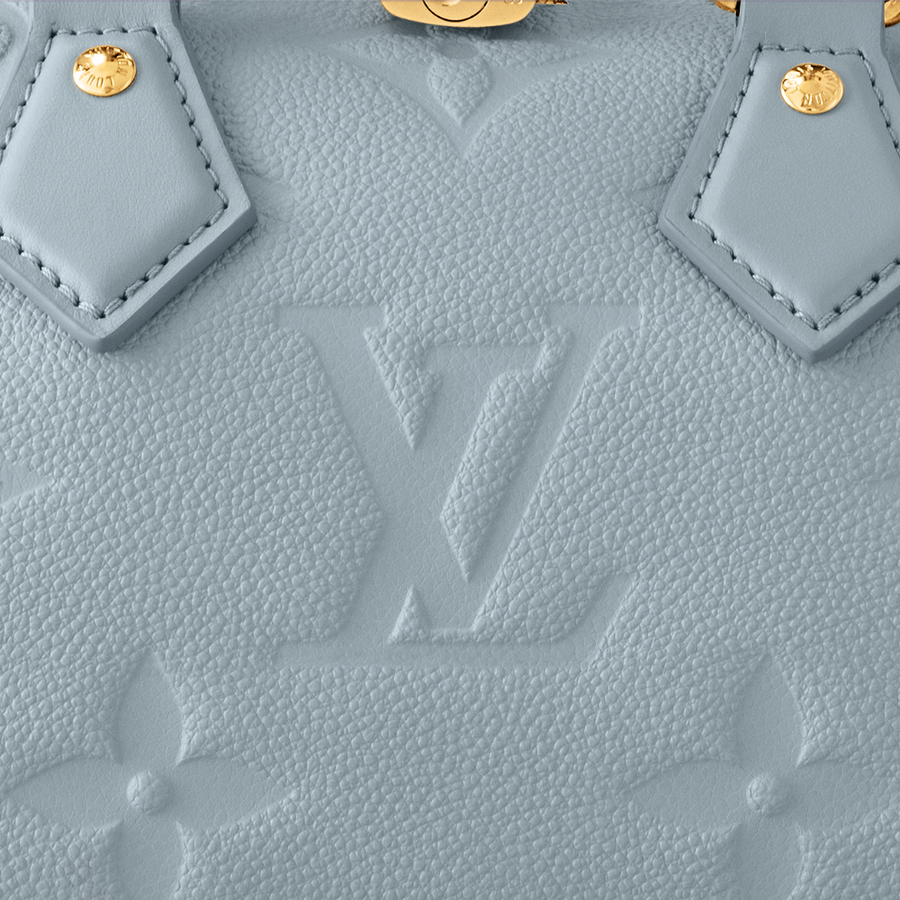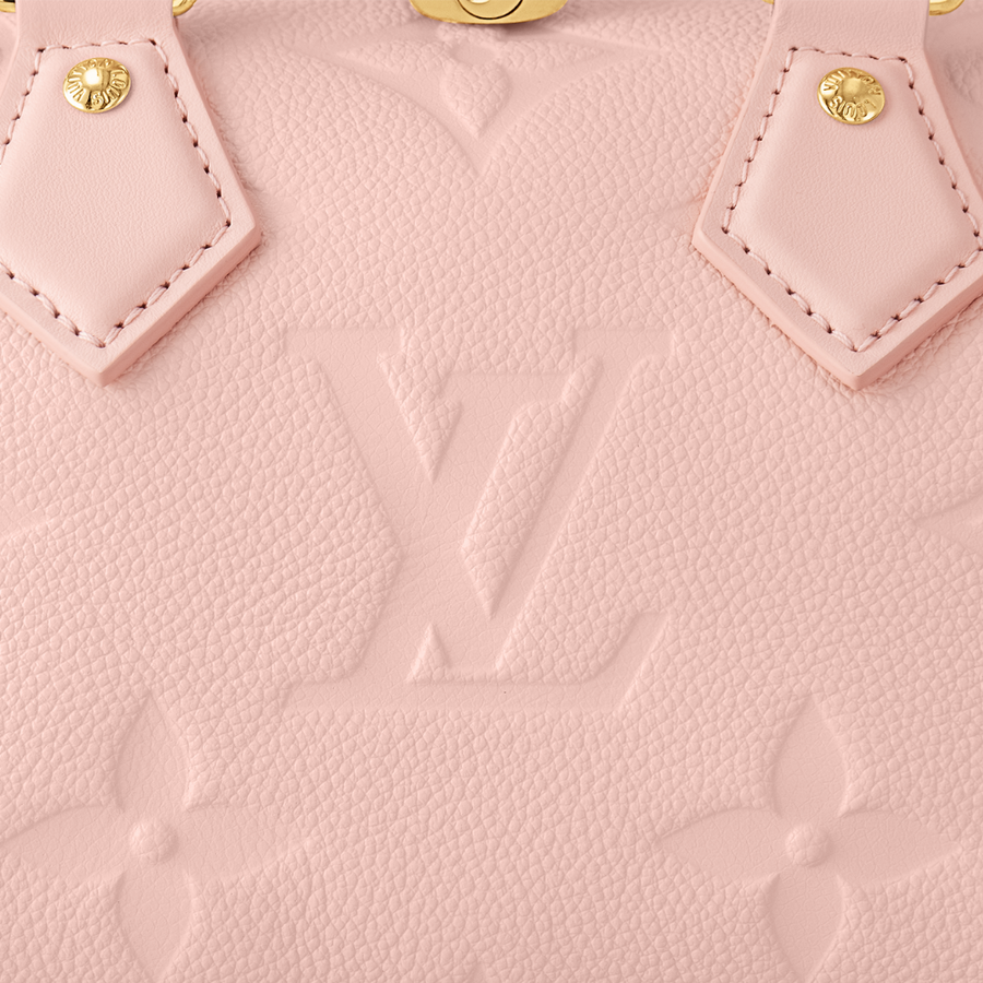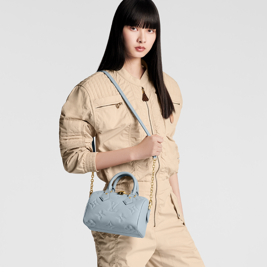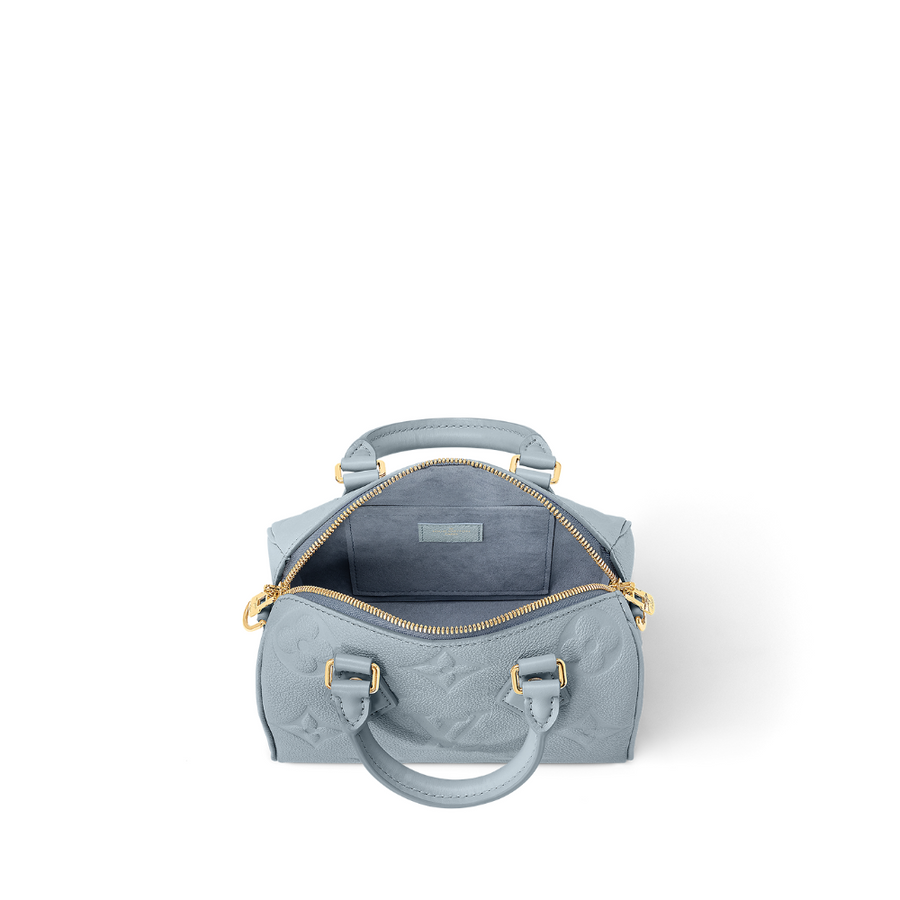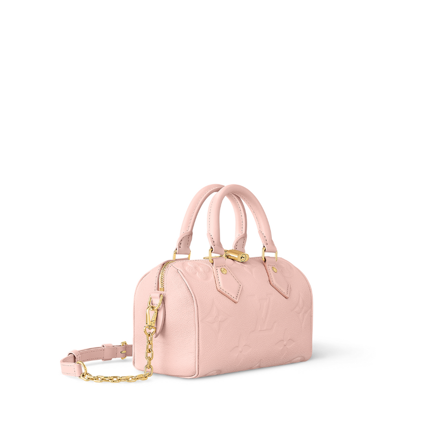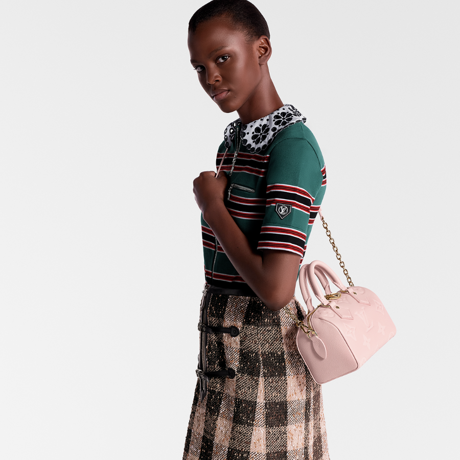 The Speedy 20 Bandoulière handbag is made from Monogram Empreinte leather in a soft pastel colorway. The bag’s unique shape is inspired by the House’s Speedy travel bag from the 1930s. A removable and adjustable chain-strap enables shoulder wear while the two top handles allow hand carry.