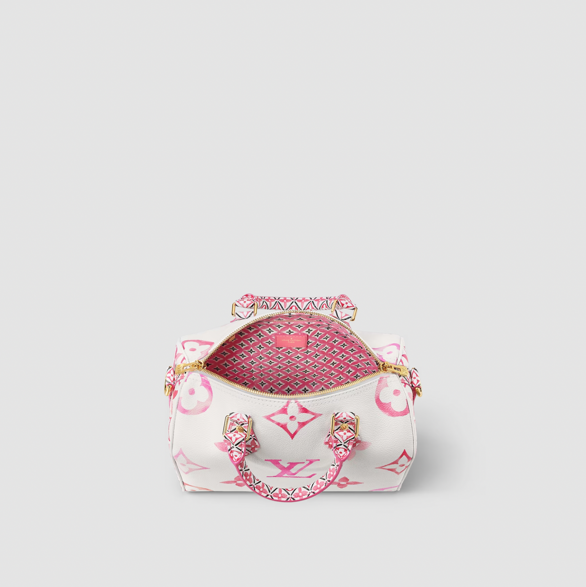 Characteristics: Crafted from coated canvas, the Speedy Bandoulière 25 handbag is adorned with a Giant Monogram pattern in nuances of pastel. The complex motifs on the trim, handles, handle mounts, and lining, in the same colorway as the rest of the bag, are inspired by the tiles at the House’s workshops in Asnières, just outside Paris.