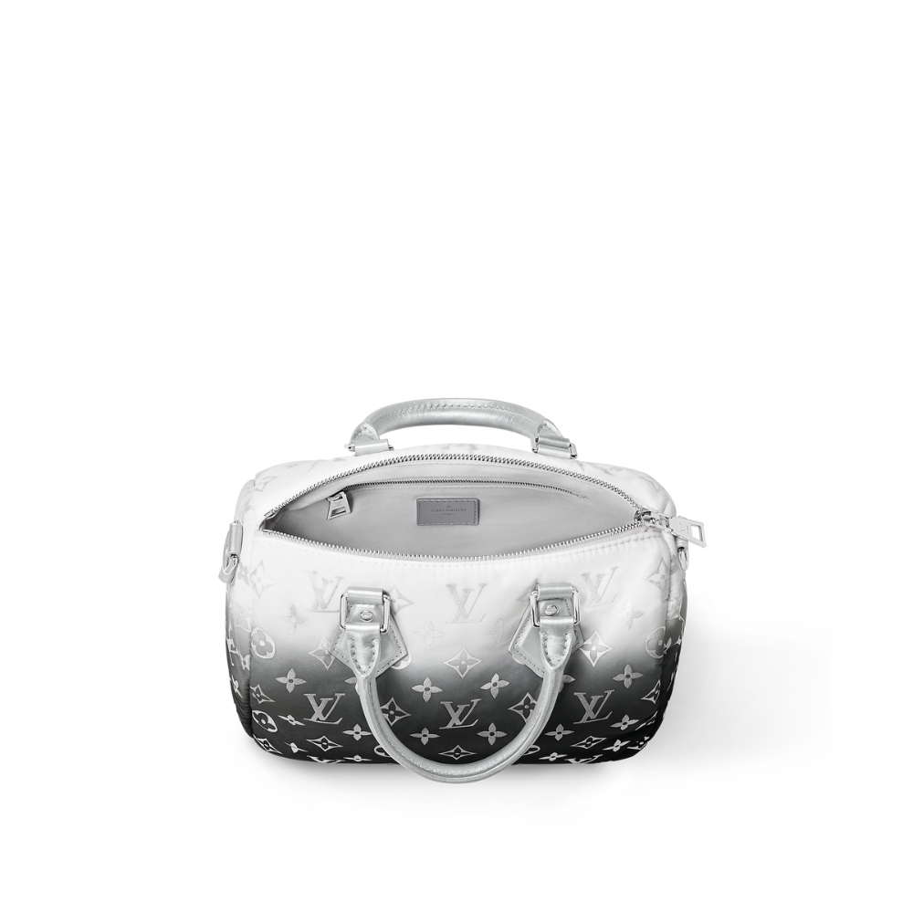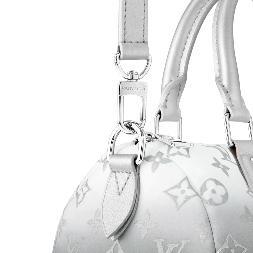 The Speedy Bandoulière 25 is part of the LV Snow collection, featuring the House’s brand-new Monogram Nylon in a striking gradient silver finish. This compact bag is enhanced with silver-toned hardware and includes a signature flower charm. It is designed to hold essential items like a smartphone, wallet, and keys, and offers various carrying options thanks to the removable and adjustable strap.