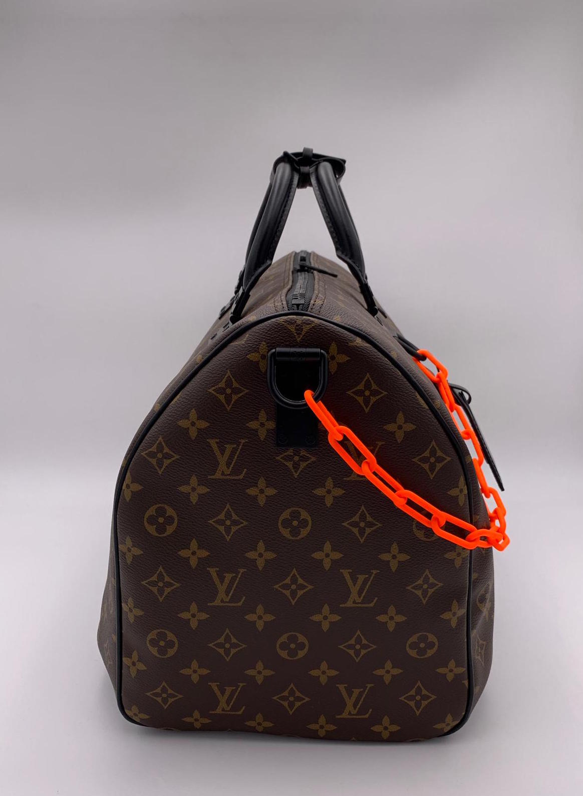 Characteristics: Virgil Abloh brings his youthful vision to the House's beloved Keepall Bandouliere 50 by adding several striking tweaks to the iconic design. The hallmark Monogram motif is accented with a matt orange chain for an urban twist. A removable leather shoulder strap featuring a matte black chain adds versatility and further contributes to the contemporary style.