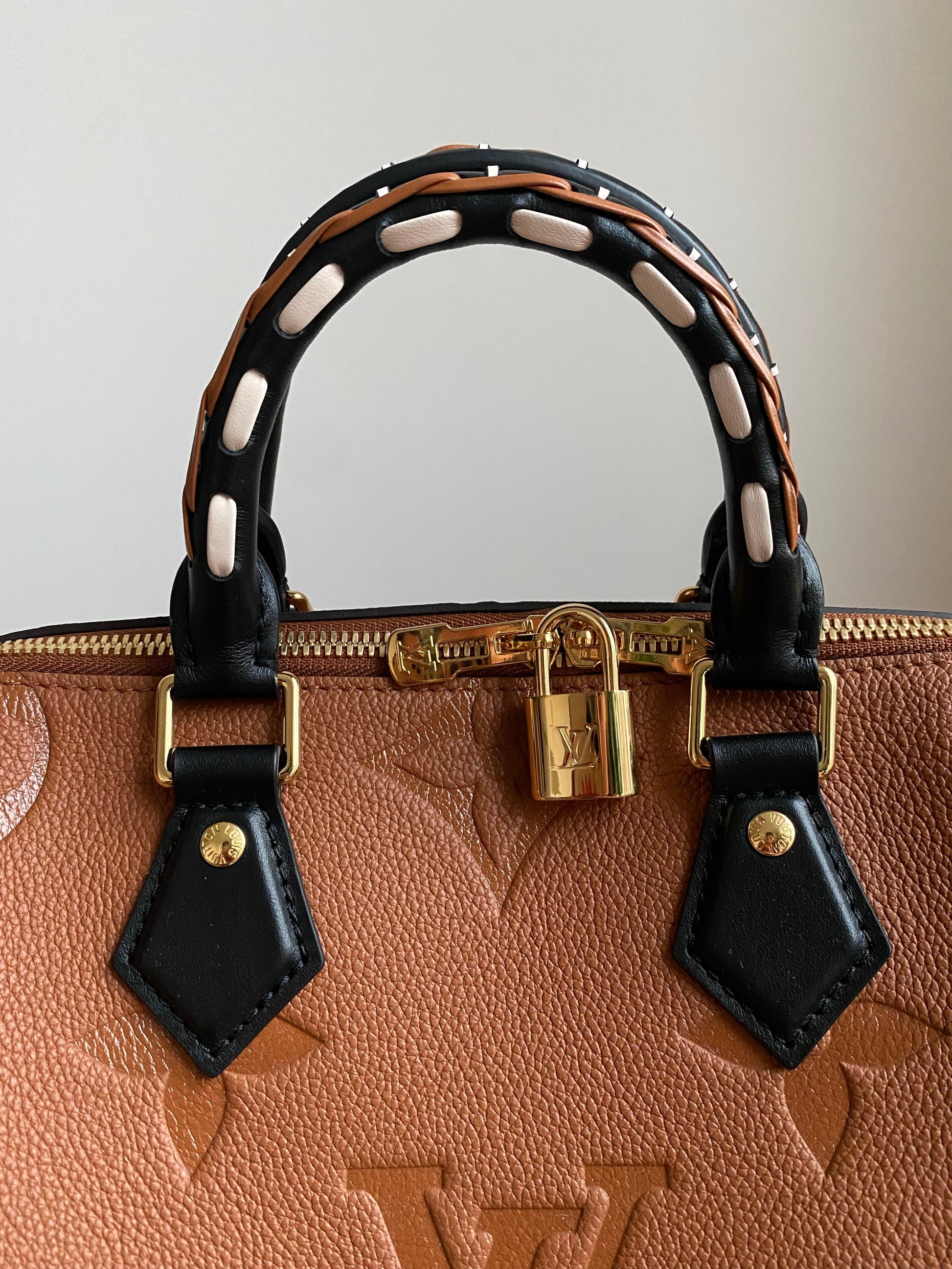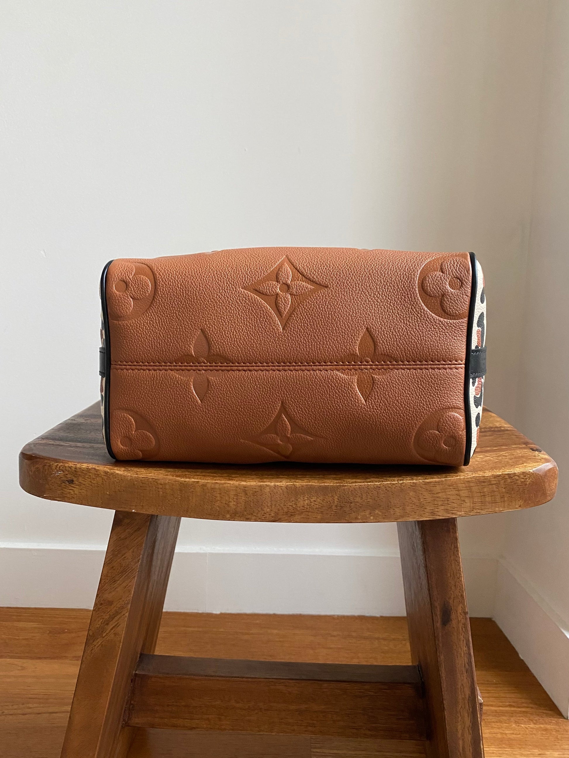 Characteristics: Revisited for the Fall 2021 Wild at Heart capsule, this Speedy Bandoulière 25 handbag makes a striking impression. It is fashioned from embossed Monogram Empreinte leather with an oversized LV pattern and a bold leopard print on the sides. The braided Toron handles are a signature of the capsule, and a detachable strap allows for cross-body wear.
