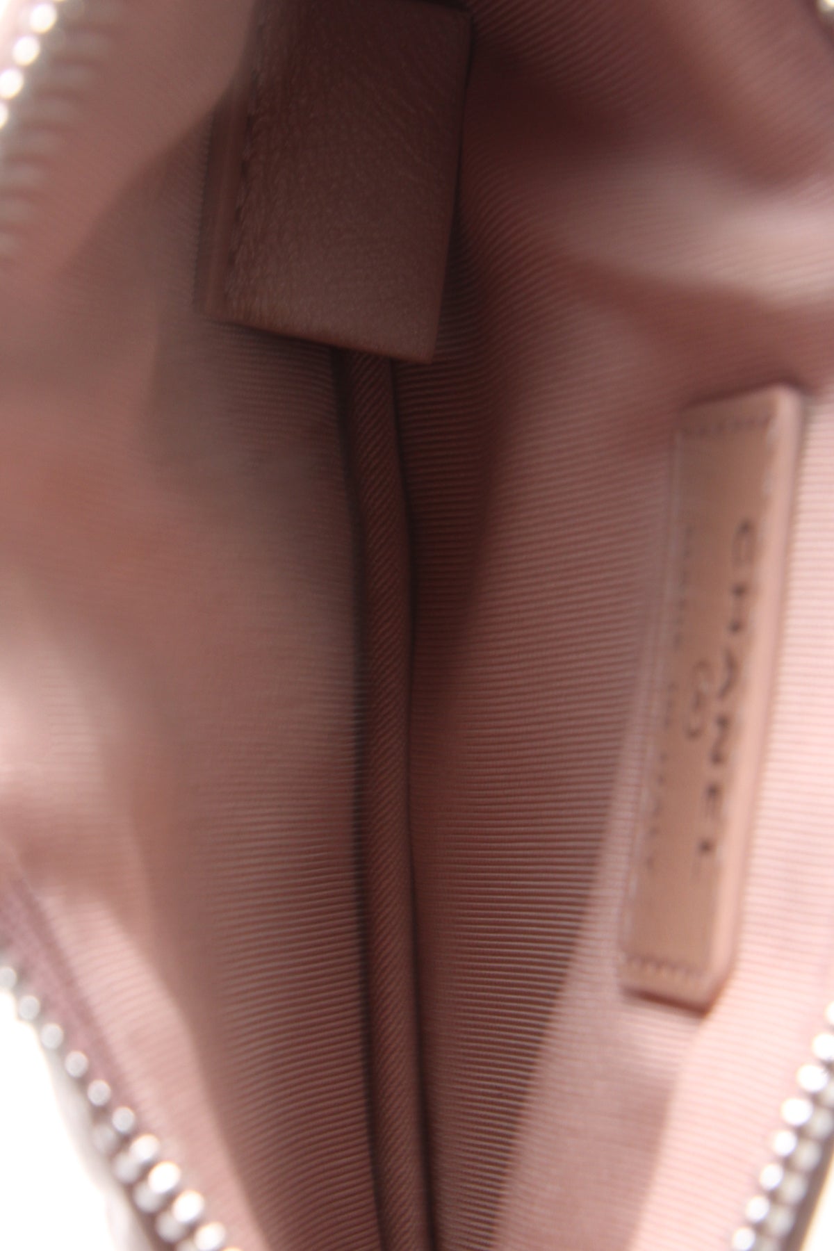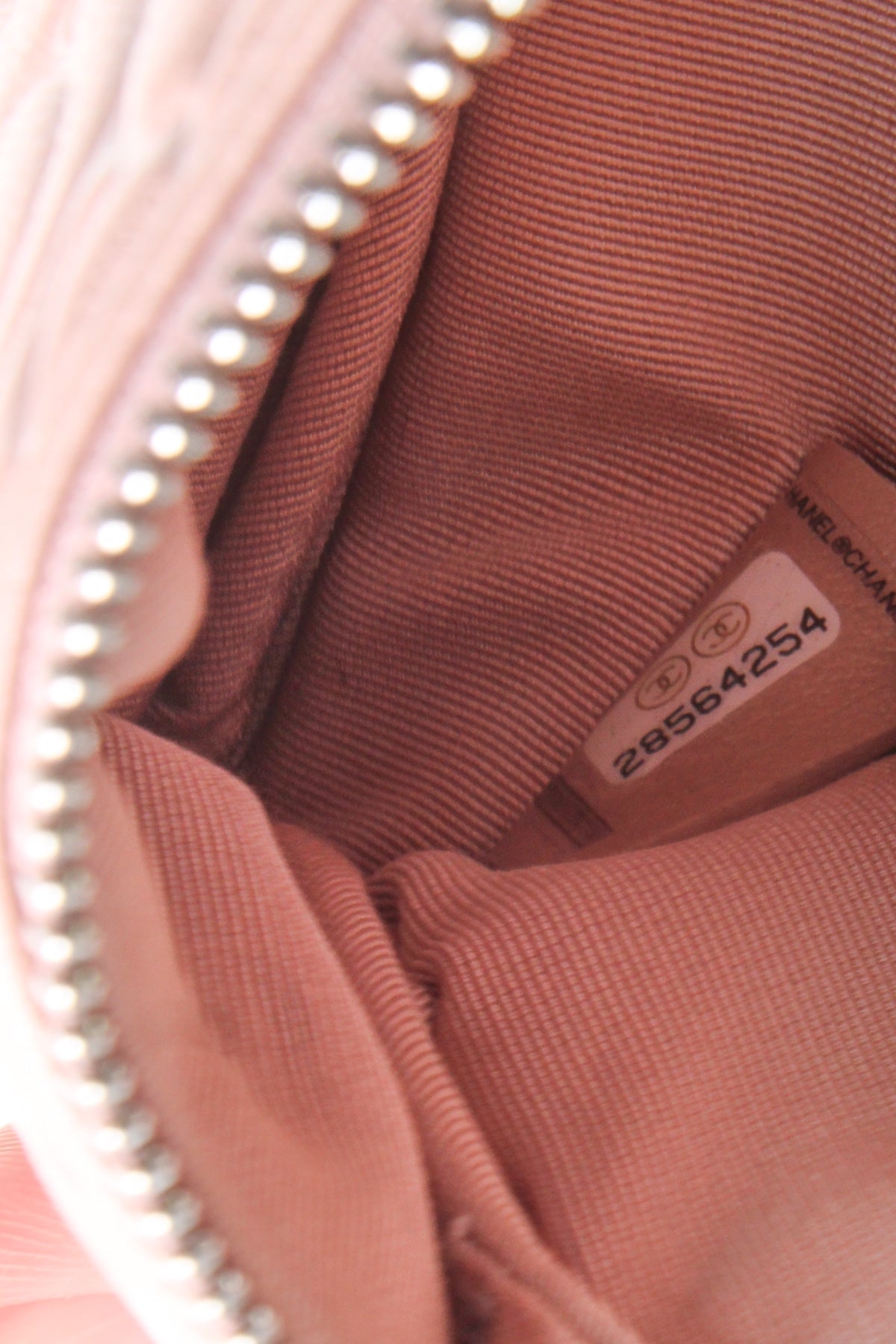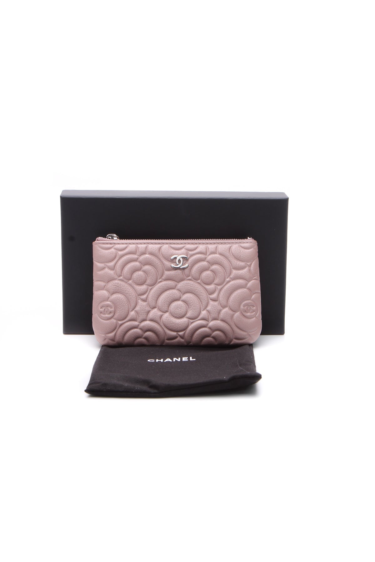 Infuse a pop of luxury into your accessory collection with this authentic Chanel Mini O Case. This piece features a camellia embossed leather exterior complemented by a light pink canvas interior and silver-tone hardware. This versatile pouch is the perfect little addition to your Chanel collection.