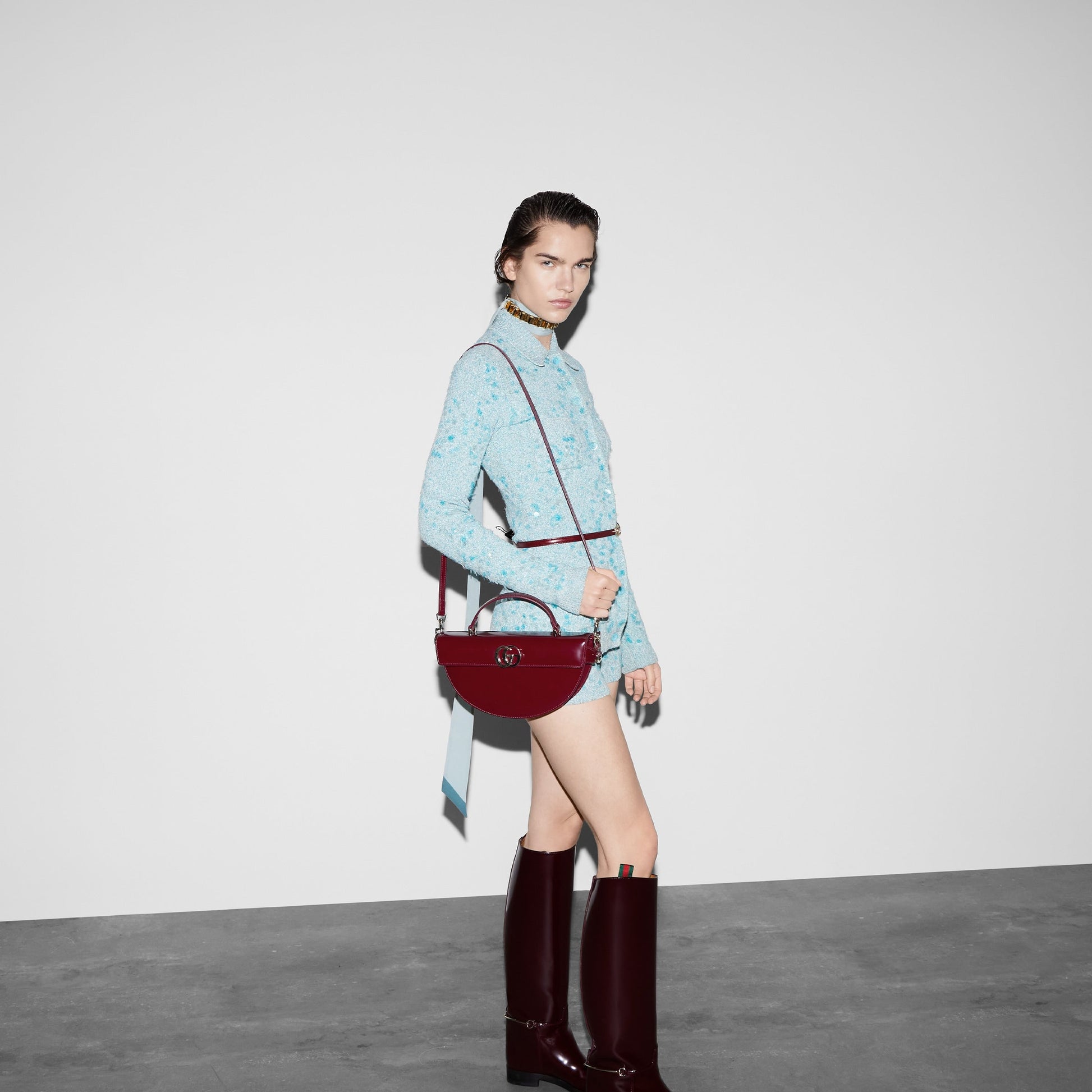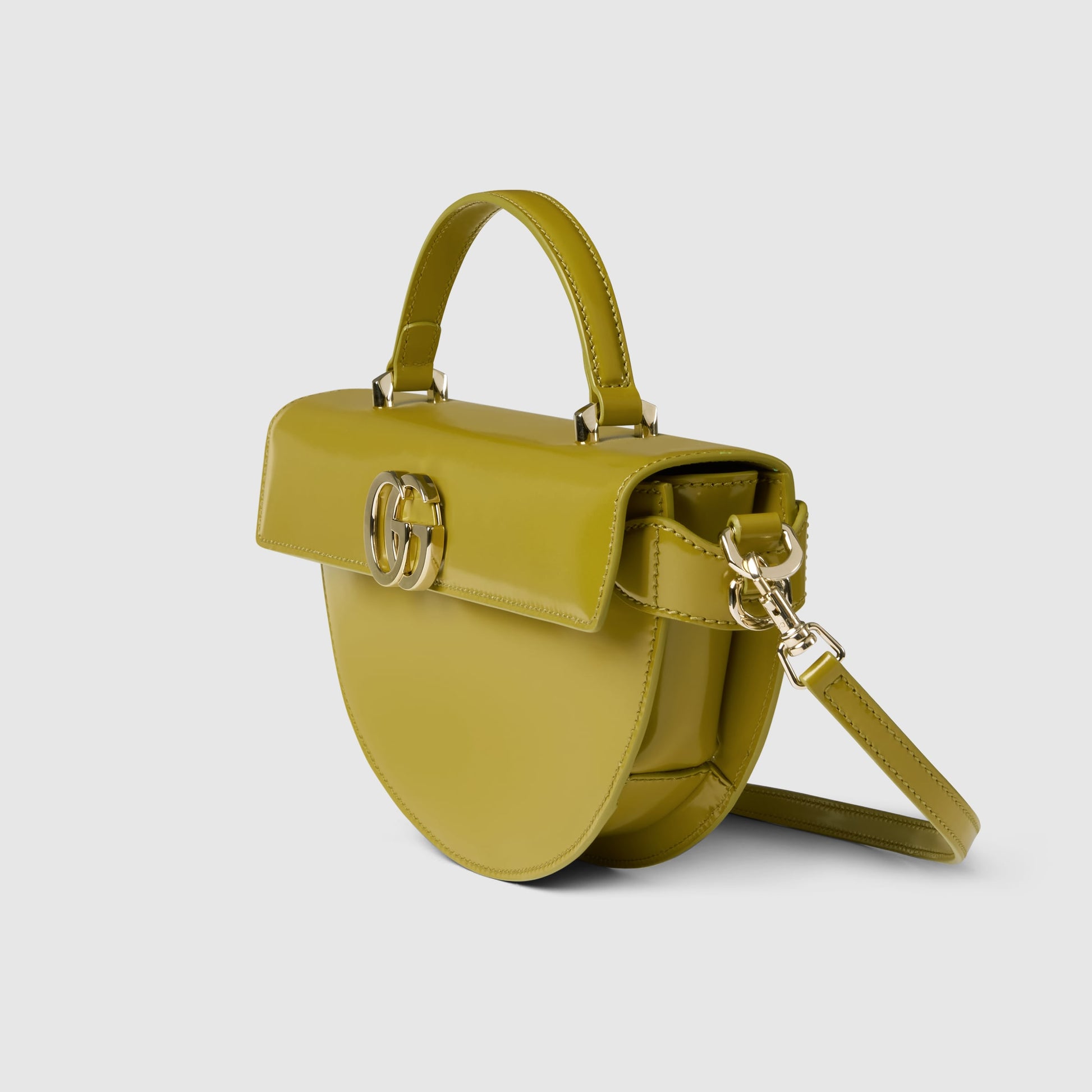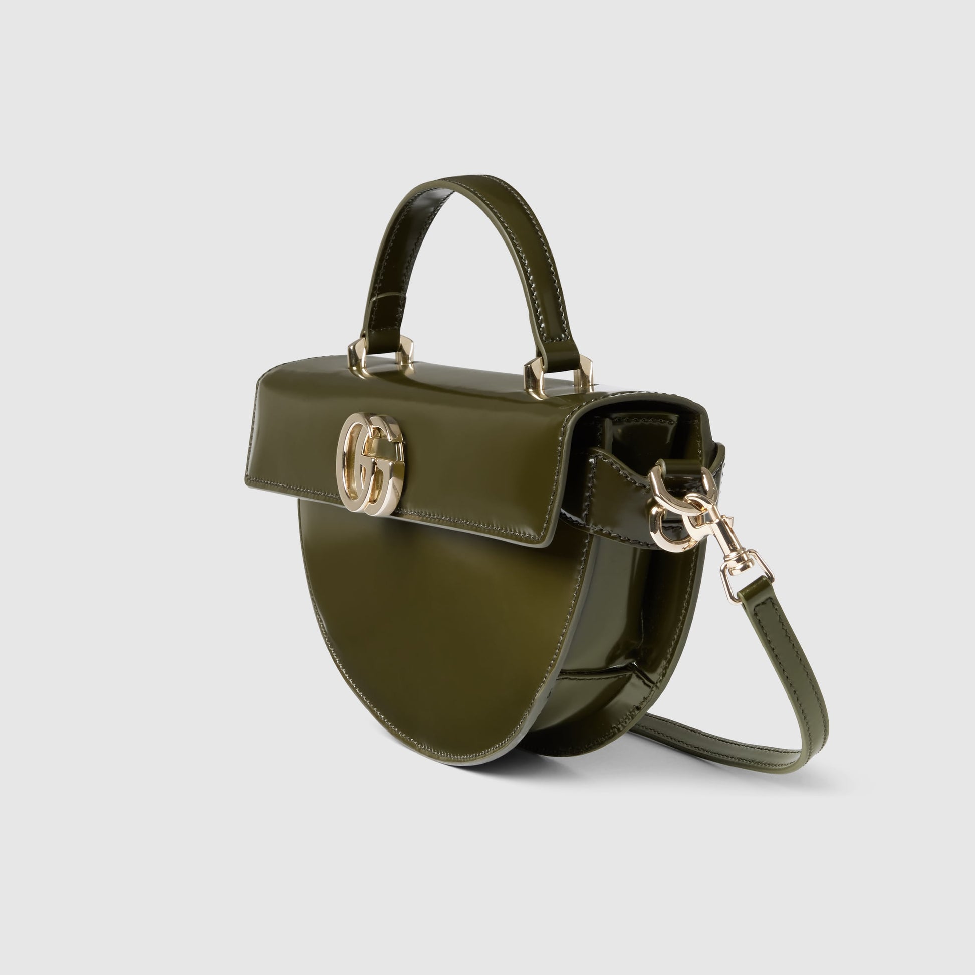 Introducing a half-moon shaped top handle bag, this style from the women's Fall Winter 2024 runway reinterprets an archival piece with a new Double G closure. It is crafted with a unique cutting technique, and makes a clicking sound when it is turned. This small size in dark olive green has an outside pocket, and is complete with a detachable shoulder strap.